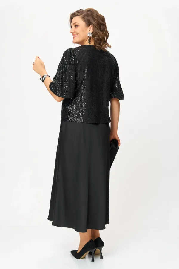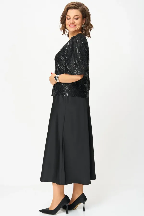 Костюм женский двухпредметный состоящий из блузки и юбки.Блузка из ткани в пайетки прямого силуэта с втачным рукавом, на трикотажной подкладке. Вырез горловины v-образный формы. Рукава длиной ¾ объемные к низу, добавляют... Читать далее...