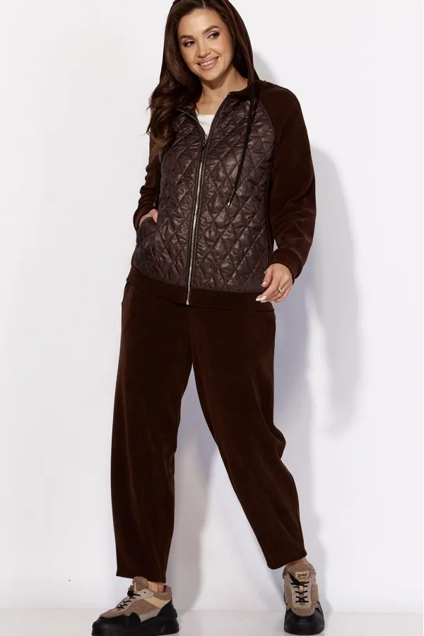 Комплект женский, 2хпредметный, состоящий из куртки и брюк. Куртка прямого силуэта с длинным рукавом. Рукав реглан с манжетой по низу. По переду и спинке рельефы из пройм. Спереди, в рельефах, карманы. Застежка центральная , на молнию. Горловина оформлена капюшоном с кулисой по краю. Низ куртки на манжете. Центральные детали переда и спинки из стежки (плащевка на синтепоне.) Брюки-слаксы, объемные, к низу зауженные. Карманы в боковых швах. Сзади накладной карман с декоративной нашивкой. Пояс цельнокройный, на резинке.