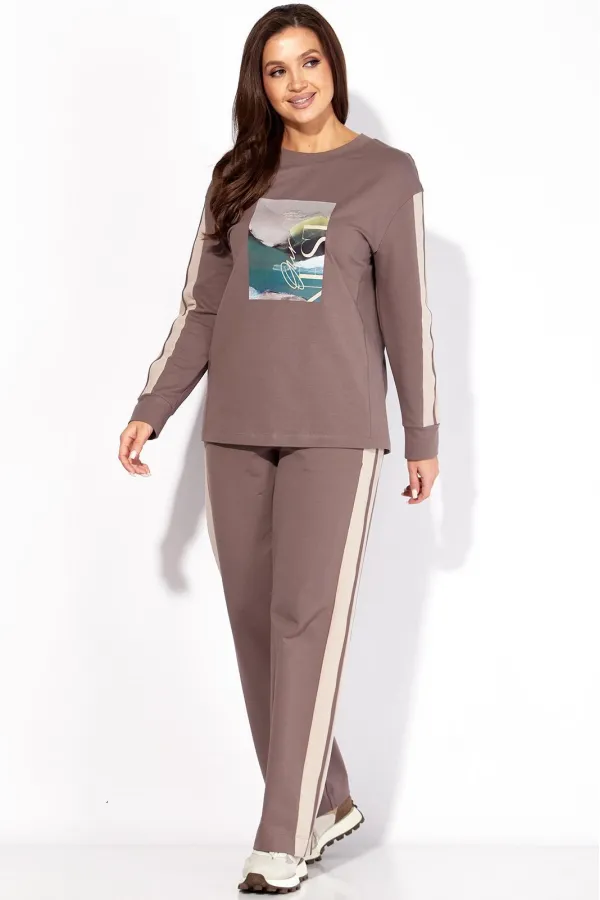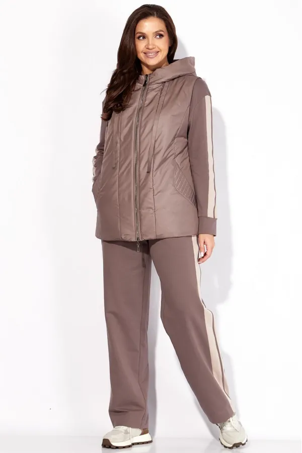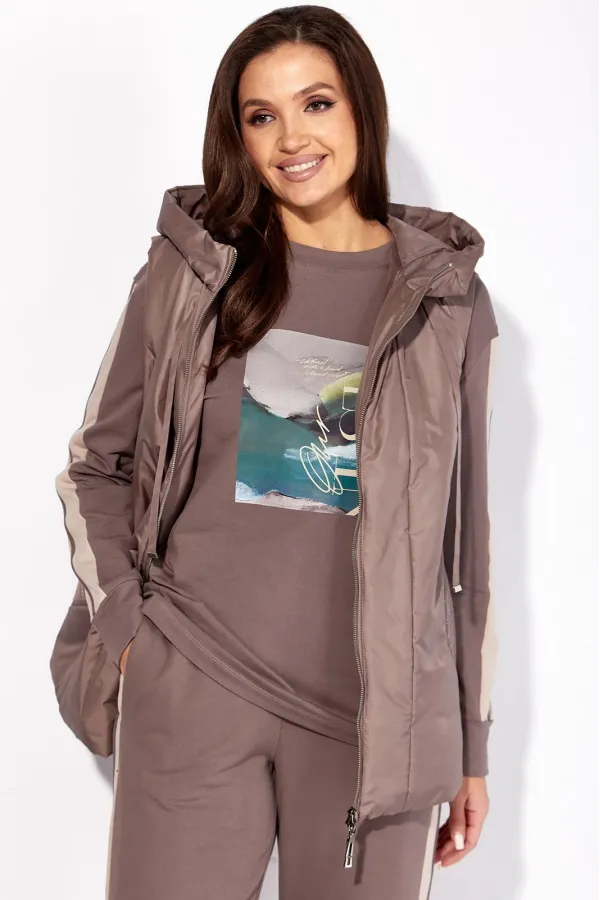 Свитшот прямого силуэта с отрезными бочками. Рукав длинный, со спущенной линией плеча, снизу на манжете. Горловина круглой формы с подрезной бейкой. Перед задекорирован принтом. Брюки прямые с карманами в боковых швах. По низу небольшой разрез. Пояс притачной с резинкой(по центру гладкий)По бокам брюк и по центру рукавов втачные отделочные лампасы с контрастным кантом. Жилет выполнен из плащевки на синтепоне(vs100) на подкладке, прямого силуэта. По переду рельефы из пройм в боковой шов. В рельефах карманы с отделочными деталями в форме клапана. Застежка центральная на тесьму молния Горловина оформлена капюшоном со стойкой и кулисой. По спинке фигурные рельефы. Центральная часть с отделочной деталью и декоративной нашивкой. Низ жилета по спинке чуть длиннее.