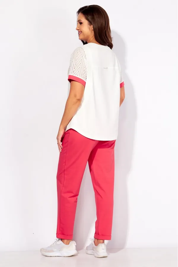 Комплект женский, 2х предметный, состоящий из блузки и брюк. Блузка прямого силуэта, выполнена в сочетании вискозного трикотажного полотна и шитья. Рукав короткий, цельнокроеный с манжетой. По переду и спинке фигурные ре... Читать далее...