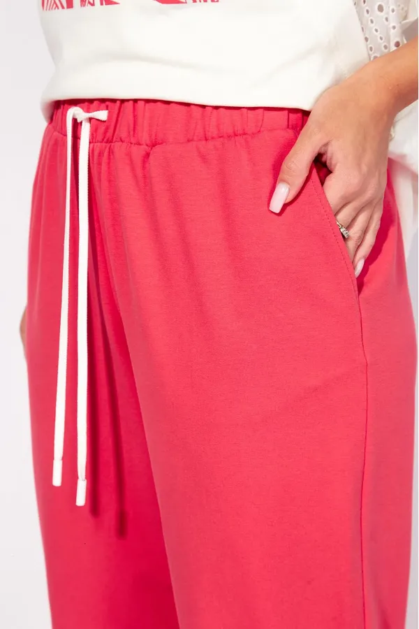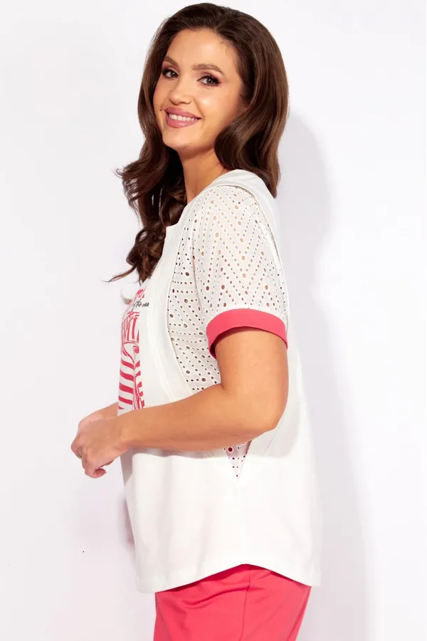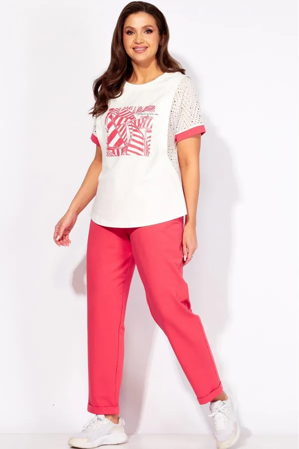Комплект женский, 2х предметный, состоящий из блузки и брюк. Блузка прямого силуэта, выполнена в сочетании вискозного трикотажного полотна и шитья. Рукав короткий, цельнокроеный с манжетой. По переду и спинке фигурные рельефы с отлетными планками. Горловина круглой формы с подрезной бейкой. Центр переда задекорирован принтом. На спинке кокетка и отделочная нашивка. Низ фигурной формы. Брюки из дресса двухнитка. Прямые, по низу с отворотами. По переду карманы. Пояс отрезной с отделочной кулисой и резинкой по кругу.