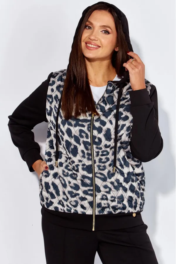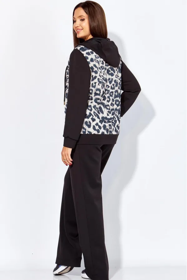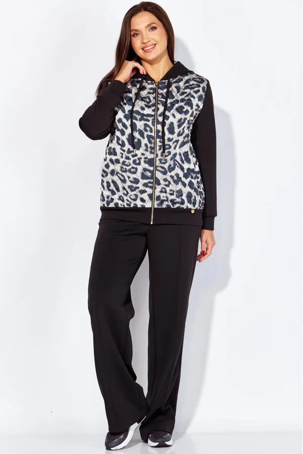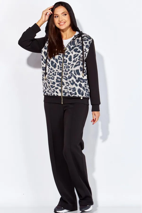Комплект женский, 2х предметный, состоящий из куртки и брюк, из стежки и трикотажного полотна. Куртка прямого силуэта, по низу на манжете. Перед и спинка выполнены из стеганной на синтепоне, с подкладкой, принтованной текстильной ткани. Карманы в боковых швах. Рукав втачной, длинный, по низу на манжете. Горловина оформлена капюшоном с кулисой. Застежка центральная на тесьму молния. Брюки широкие, прямые. По боку подрезной лампас с отделочной строчкой и карманы. По центру переда прострочены защипы (стрелка) Капюшон, рукава, манжет низа куртки и брюки из трикотажного полотна.