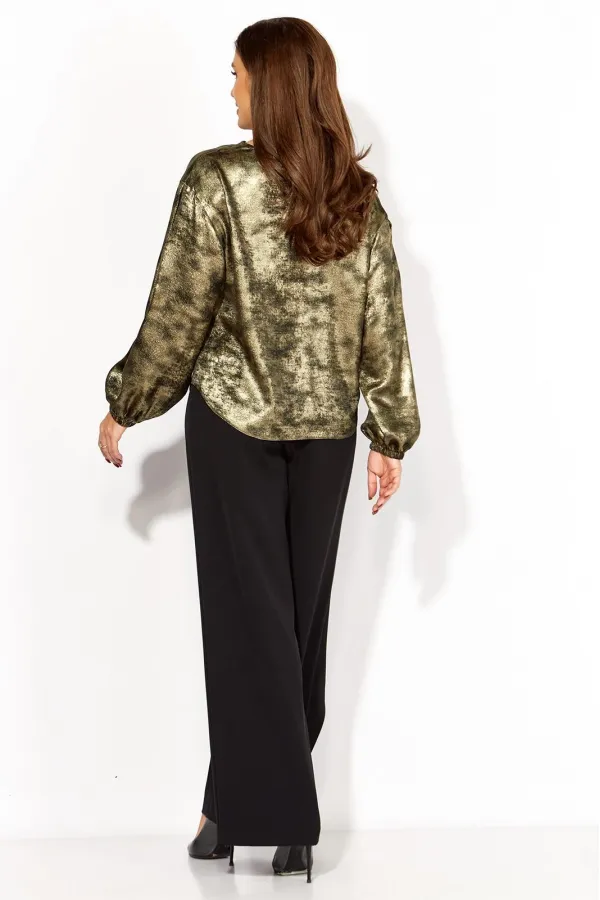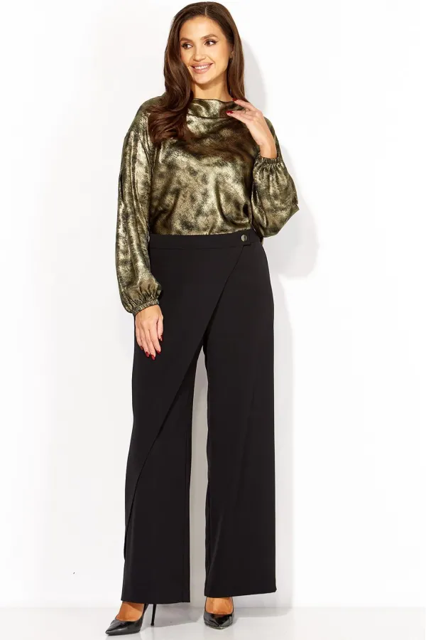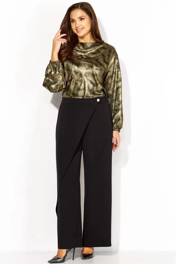 Комплект женский, 2х предметный, состоящий из блузки и брюк. Блузка прямого силуэта с длинным рукавом. Рукав со спущенной линией плеча, мягкой складкой и резинкой по низу. Вырез горловины лодочка По переду в области горловины, мягкие складки (качели) Низ блузки ажурной формы. Брюки прямые, из текстильной ткани, с отлетной деталью по переду, закрепленной на отделочную кнопку. застежка брюк спереди на тесьму молния и петлю с пуговицей. Пояс отрезной, по переду гладкий, сзади на резинке.