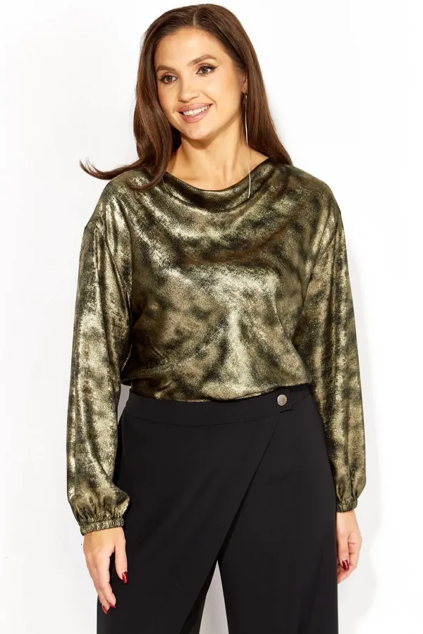 Комплект женский, 2х предметный, состоящий из блузки и брюк. Блузка прямого силуэта с длинным рукавом. Рукав со спущенной линией плеча, мягкой складкой и резинкой по низу. Вырез горловины лодочка По переду в области горл... Читать далее...