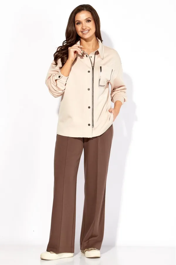 Костюм женский, 2х предметный, изготовлен из трикотажного полотна T E N S E L , состоящий из рубашки и брюк. Рубашка прямого силуэта с длинным рукавом. Рукав со спущенной линией плеча. По низу манжета, с застежкой на кнопку. Застежка центральная, с отрезной планкой на кнопки и чуть смещенную тесьму «молния» Воротник рубашечный, на стойке. На левой полочке карман, акцентированный принтом. Плечевые швы, проймы, воротник и низ изделия выполнеы с открытым срезом, с закрепляющей строчкой. Брюки широкие, прямые. По боку подрезной лапмас и карманы. По центру переда пристрочены защипы «стрелки» Пояс притачной, с гладкой центральной частью, дальше резинка по кругу.