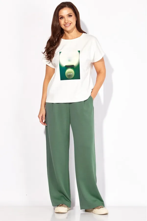 Комплект женский, 3х предметный, состоящий из жакета, топа и брюк. Жакет и брюки выполнены из трикотажного полотна T E N S E L, топ-хлопковый трикотаж (кулирка). Жакет прямого силуэта с длинным рукавом. Рукав со спущенной линией плеча, по низу манжета. По рукаву отделочный лампас со складками. Воротник отложной с лацканами. Застежка центральная на петли и пуговицы. На левой полочке накладной карман. По низу жакета отрезная планка. Спинка со средним швом. Брюки прямые, с наклонными карманами спереди и мягкими складками. По боку отделочный лампас со складками. Пояс притачной, с резинкой и гладкой центральной частью. Топ прямого силуэта, с коротким цельнокройным рукавом. Горловина круглая, с отрезной планкой. По переду топа яркий принт