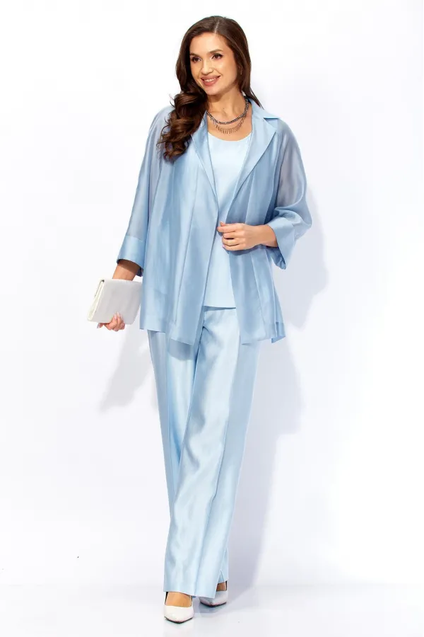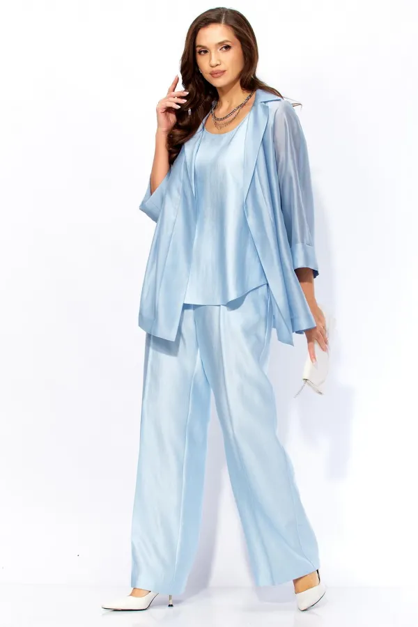 Комплект женский, 3х предметный, состоящий из блузки, топа и брюк. Блузка прямого силуэта, с рукавом покроя реглан, длинной 3/4. По низу рукава отложная манжета. Воротник пиджачного типа с широкой планкой. По бокам разрезы. Блуза без застежки со съемным поясом. Топ без рукавов, с круглым вырезом горловины. Брюки длинные. По переду застрочены защипы стрелки и наклонные карманы. Застежка на тесьму молния под гульфик. Пояс притачной, с резинкой сзади и застежкой на петлю и пуговицу.