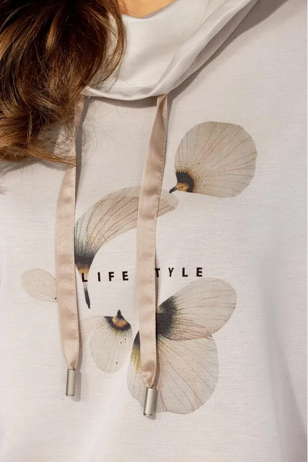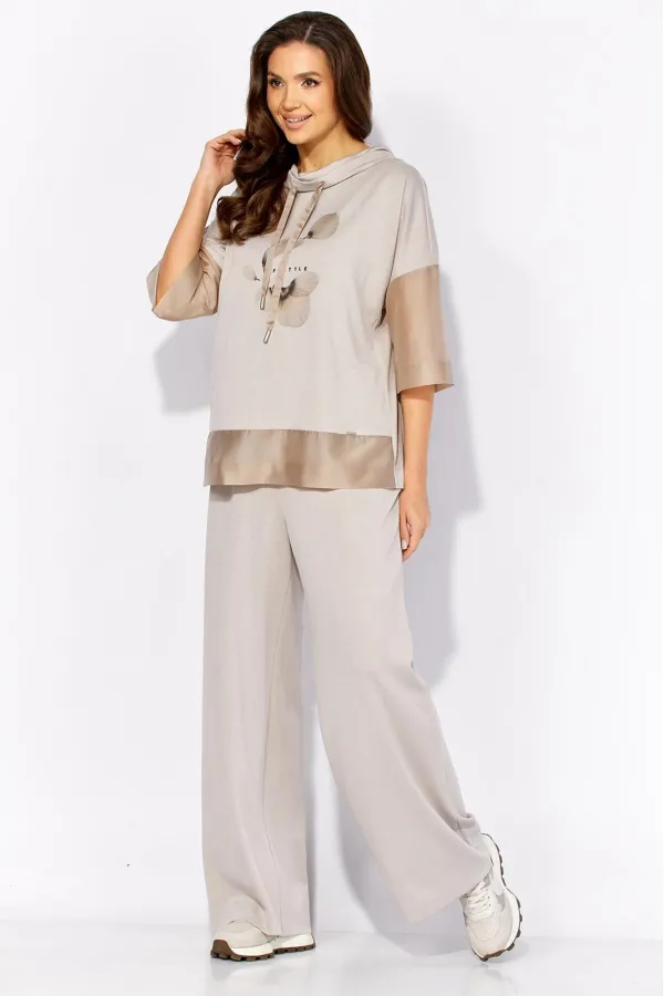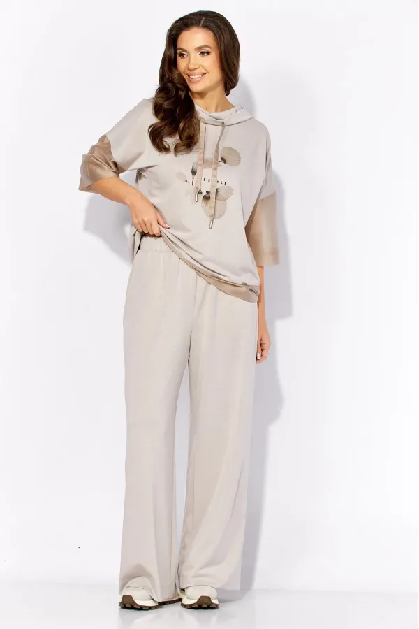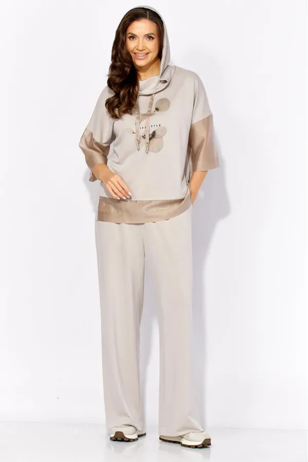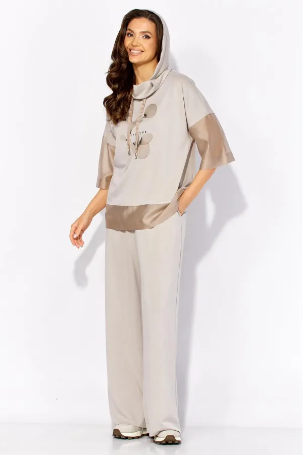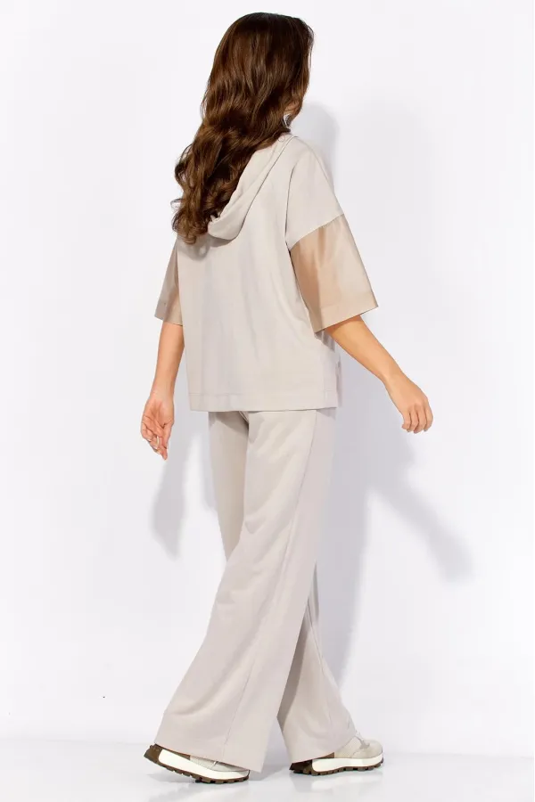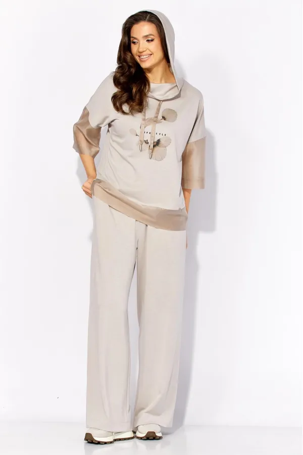 Комплект женский, 2х предметный, состоящий из блузы и брюк, выполнен из тонкого трикотажного полотна с отделкой из вуали. Блуза прямого силуэта с рукавом длинной до локтя. Рукав со спущенной линией плеча из отделочной ткани. По бокам узкие, подрезные бочки. Горловина оформлена капюшоном с кулисой. Перед задекорирован принтом. По спинке средний шов. Брюки прямые, широкие. По переду наклонные карманы. Пояс притачной, на резинке по кругу