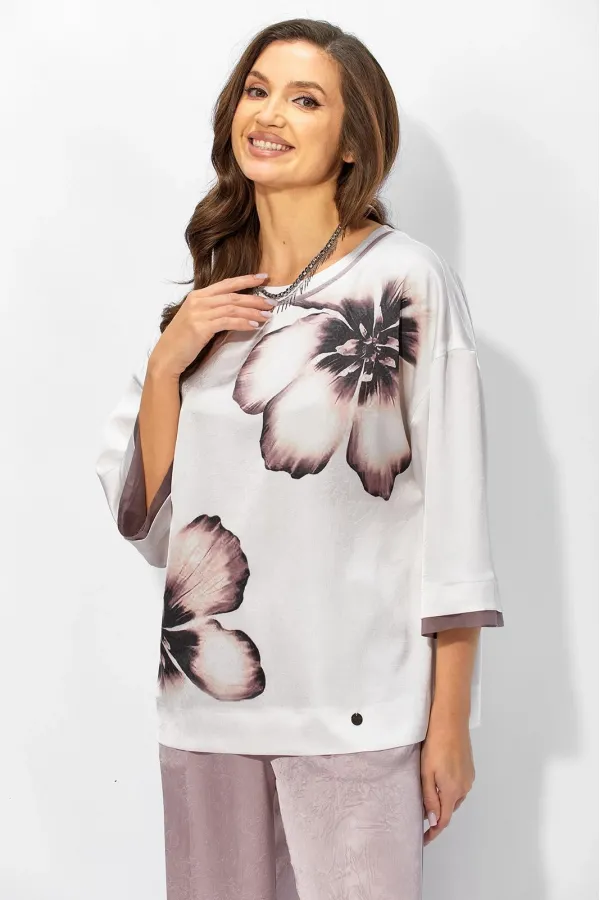 Комплект женский, 2-предметный, состоящий из блузы и брюк. Блуза прямого силуэта с рукавом длинной 3/4. Рукав со спущенной линией плеча. По низу рукава планка, с отлетными деталями из отделочной ткани (вуалька). Горловин... Читать далее...