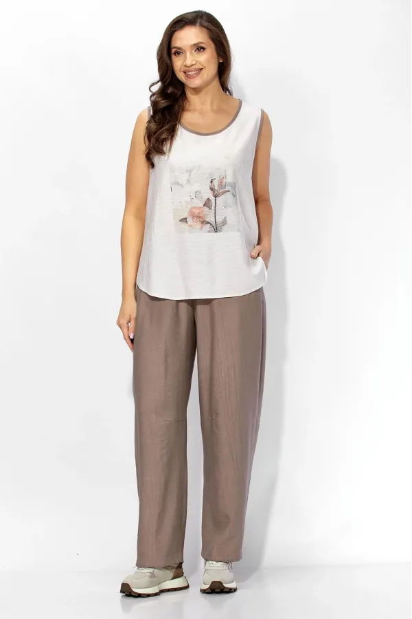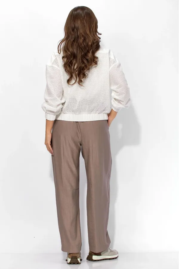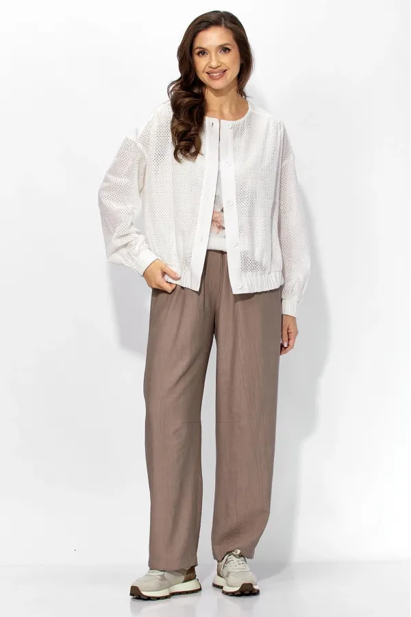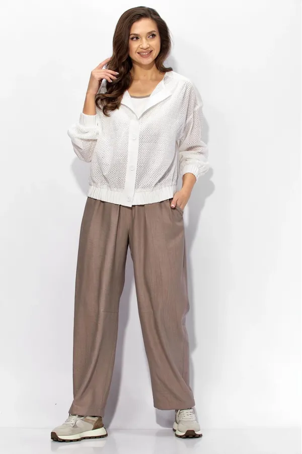 Комплект женский, 3х предметный, состоящий из бомбера , топа и брюк. Бомбер выполнен из ткани шитье с отделкой, прямого силуэта с длинным рукавом. Рукав со спущенной линией плеча. По низу рукава и бомбера, притачные манжеты с резинкой. Вырез горловины круглой формы . Застежка центральная, с отрезной планкой, на петли и пуговицы. Кокетка цельная, на перед и спинку. По центру спинки небольшая сборка. Брюки баррель объемные. По переду карманы. По шаговому шву вытачки, создающие объем в районе колена. Брюки без застежки, с имитацией гульфика Пояс притачной с резинкой по кругу и кулисой. Топ без рукавов. Горловина круглая, углубленная. Проймы и горловина окантованы бейкой в цвет брюк. Низ топа фигурной формы. Перед задекорирован принтом. Топ и брюки изготовлены из крешованной, вискозной ткани.