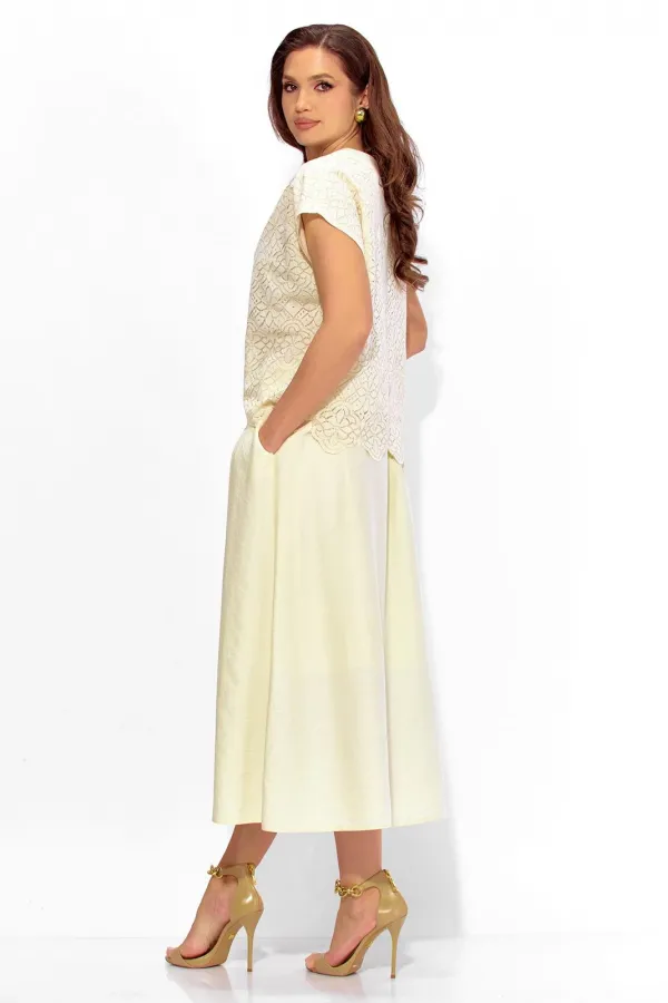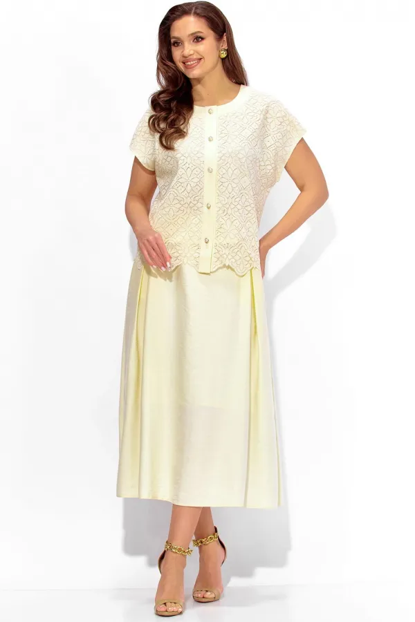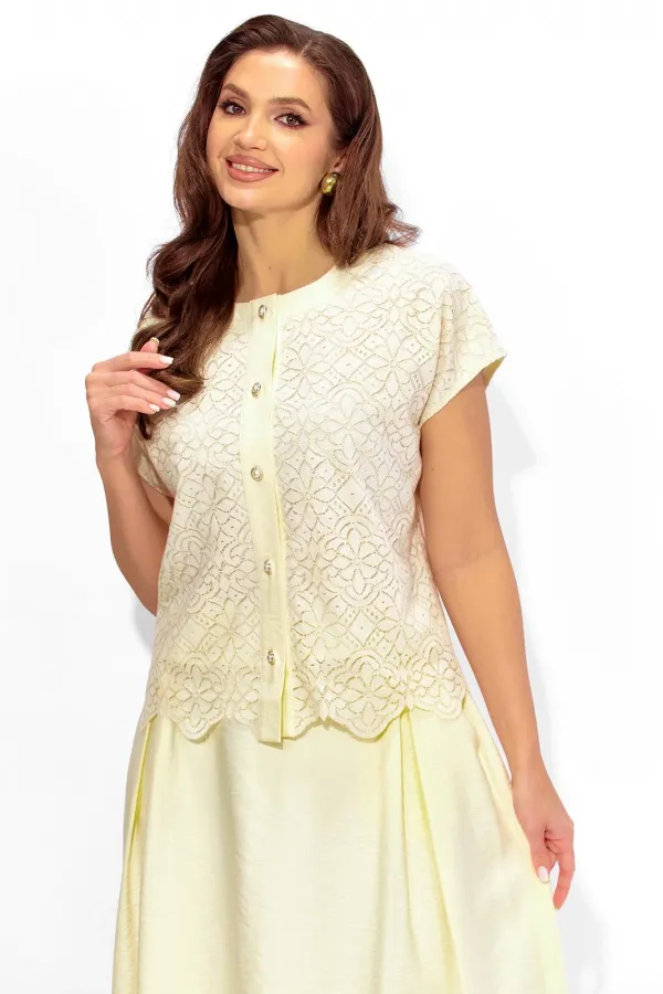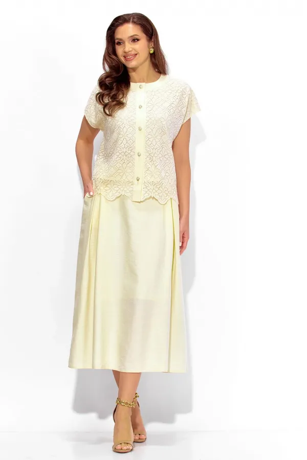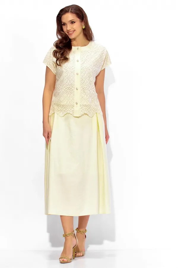 Комплект женский, 2х предметный, состоящий из блузки и юбки. Блузка выполнена из кружевного полотна, с отделочной тканью, на хлопковой подкладке. Блузка прямого силуэта, с цельнокройным коротким рукавом. Вырез горловины круглой формы с отделочной планкой. Застежка центральная, с планкой, на петли и пуговицы. Низ блузки фигурный. Юбка расширенная, из текстильной вискозной ткани, на хлопковой подкладке. По переду мягкие встрачные складки и наклонные карманы. Пояс притачной, по переду гладкий, сзади с резинкой. Комплект женский, 2х предметный, состоящий из блузки и юбки. Блузка выполнена из кружевного полотна, с отделочной тканью, на хлопковой подкладке. Блузка прямого силуэта, с цельнокройным коротким рукавом. Вырез горловины круглой формы с отделочной планкой. Застежка центральная, с планкой, на петли и пуговицы. Низ блузки фигурный. Юбка расширенная, из текстильной вискозной ткани, на хлопковой подкладке. По переду мягкие встрачные складки и наклонные карманы. Пояс притачной, по переду гладкий, сзади с резинкой.