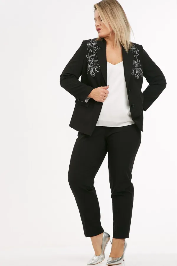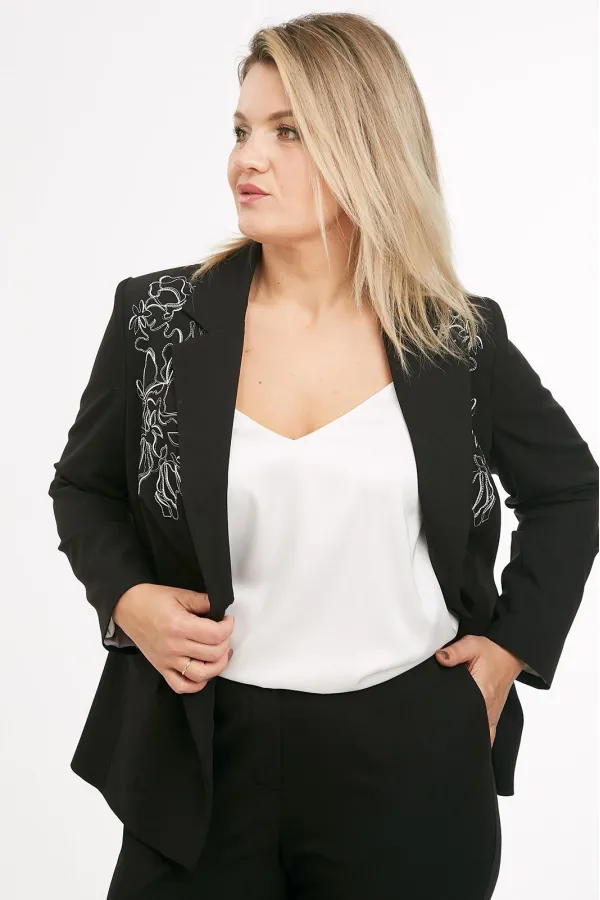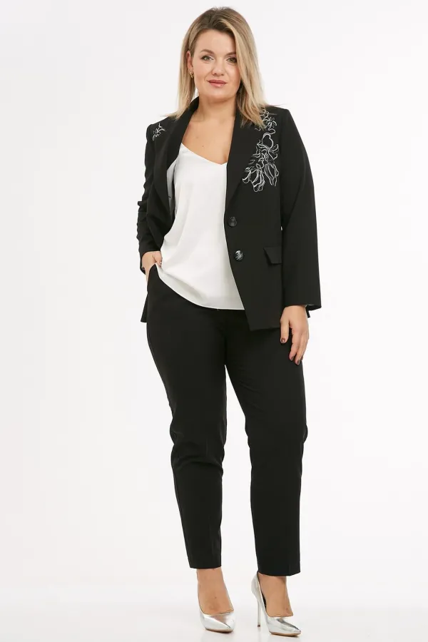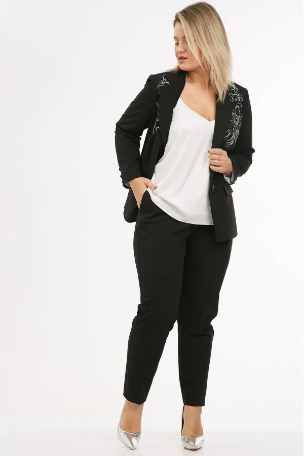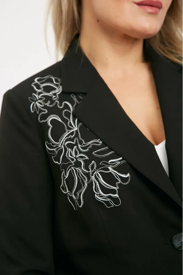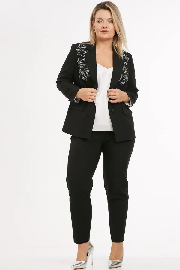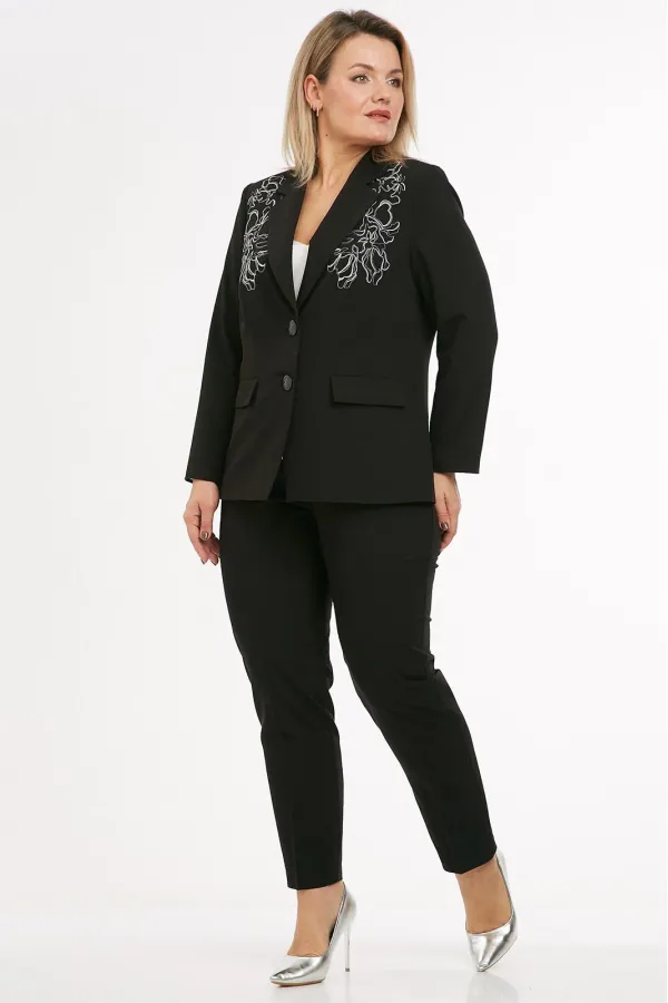 Жакет из костюмной ткани на подкладке, полуприлегающего силуэта, с отложным воротником и лацканами, с центральной бортовой застежкой на петли и пуговицы. Перед с талиевыми вытачками, прорезными карманами с клапаном и вышивкой в области груди. Спинка со средним и рельефными швами. Рукав втачной двухшовный. Воротник отложной пиджачного типа.