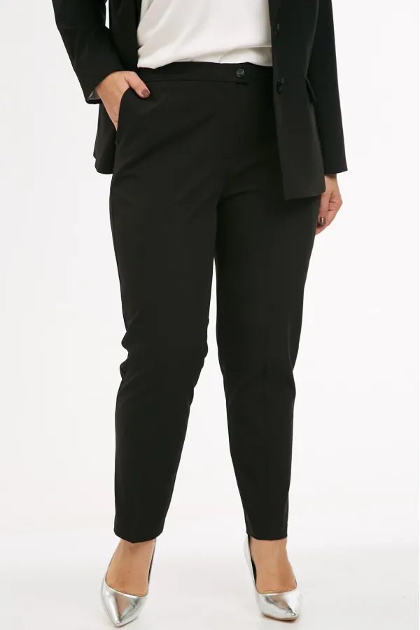 Брюки зауженные к низу, с карманами в боковых швах, гульфиком с застежкой-«молнией», на поясе с резинкой по спинке, и застежкой на петли и пуговицы. Длина 104 см.