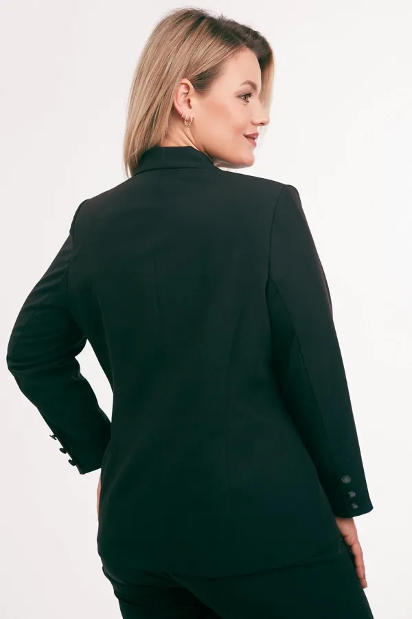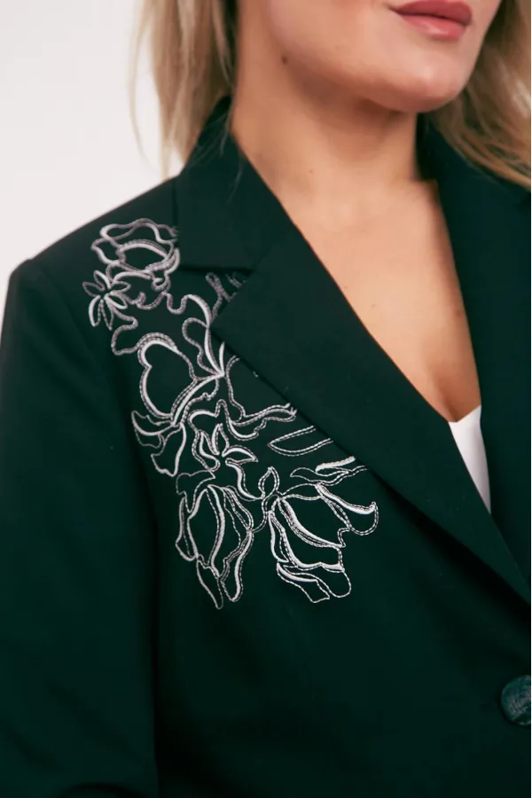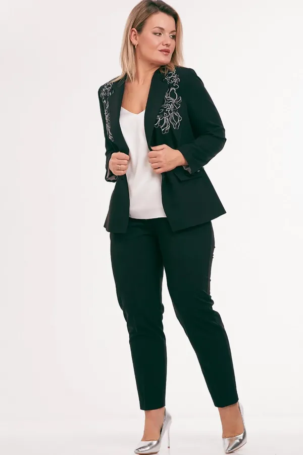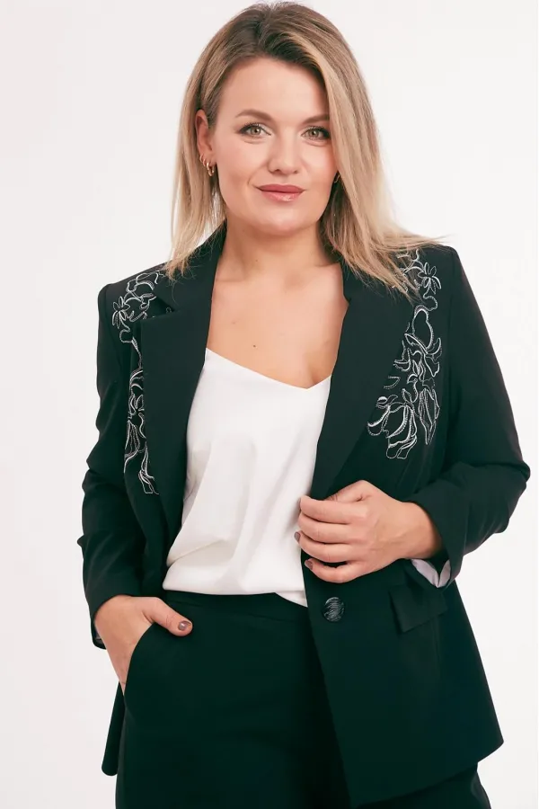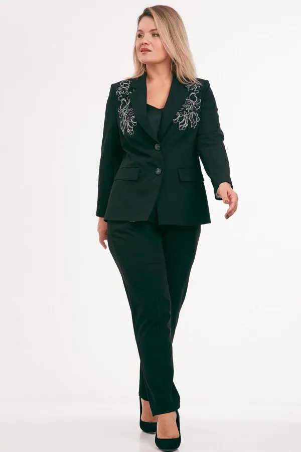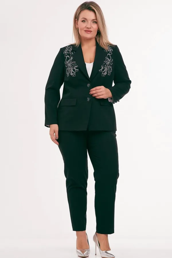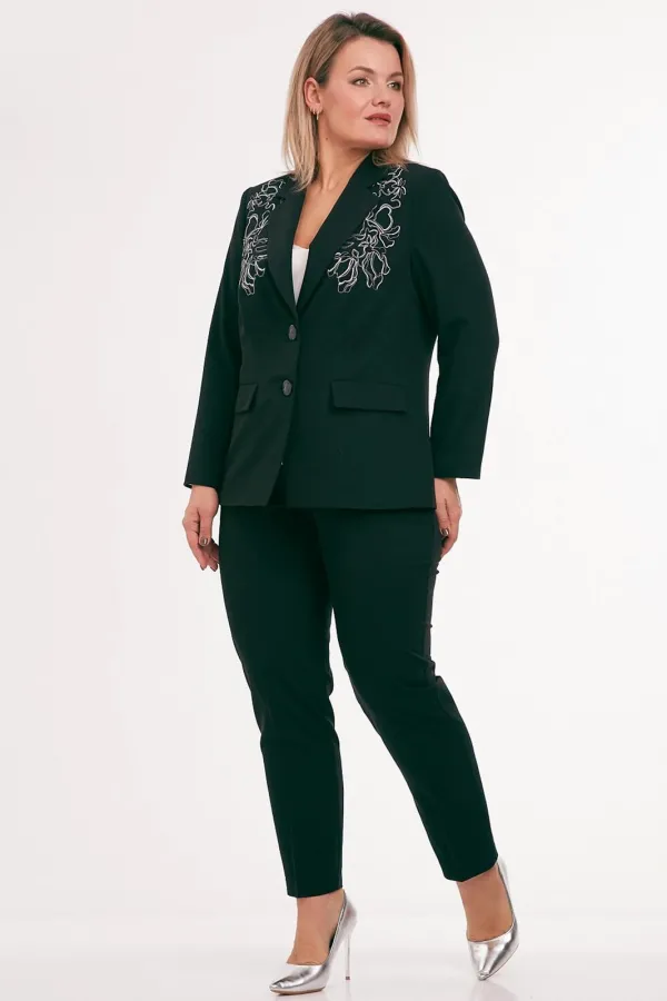 Жакет из костюмной ткани на подкладке, полуприлегающего силуэта, с отложным воротником и лацканами, с центральной бортовой застежкой на петли и пуговицы. Перед с талиевыми вытачками, прорезными карманами с клапаном и вышивкой в области груди. Спинка со средним и рельефными швами. Рукав втачной двухшовный. Воротник отложной пиджачного типа.