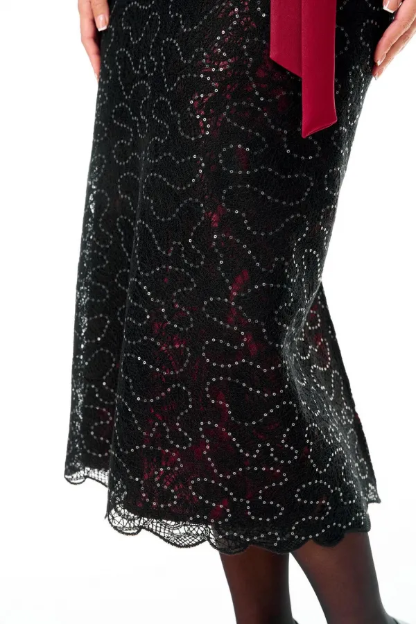 Юбка из плотного черного кружева на красной саржевой подкладке зауженная к низу с разрезом по спинке. Застежка «потайная молния» по среднему шву спинки.