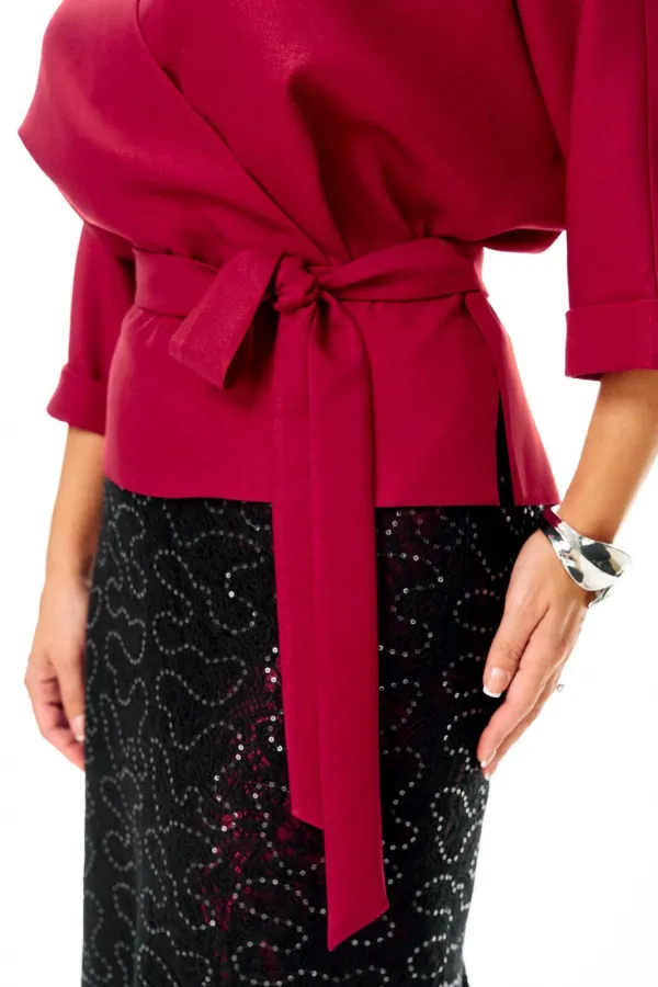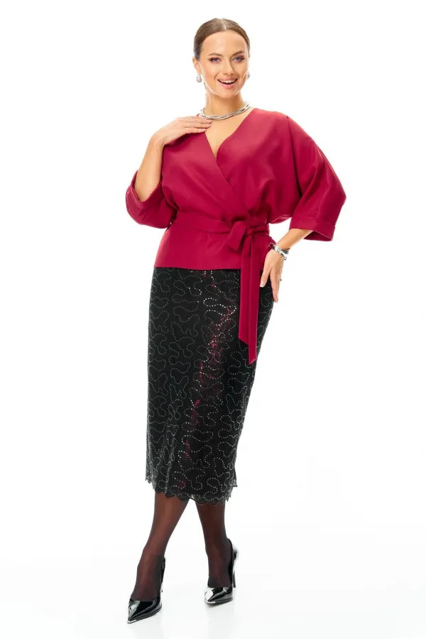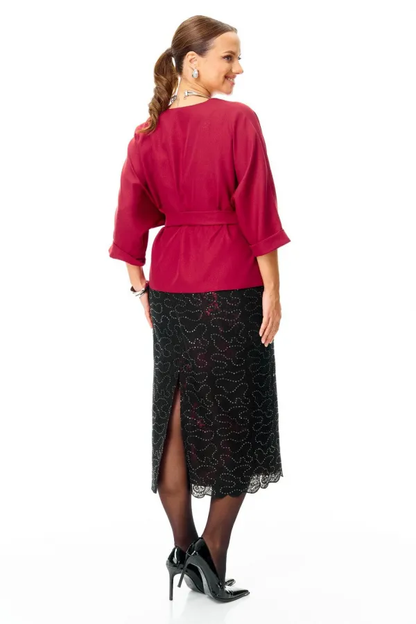 Комплект: блуза и юбка.Эффектный нарядный комплект в страстном цветовом сочетании глубокого красного с черным, блеск и кружево.Блуза свободного силуэта. Горловина «на глубокий запах». Рукав цельнокроеный с манжетой. По н... Читать далее...