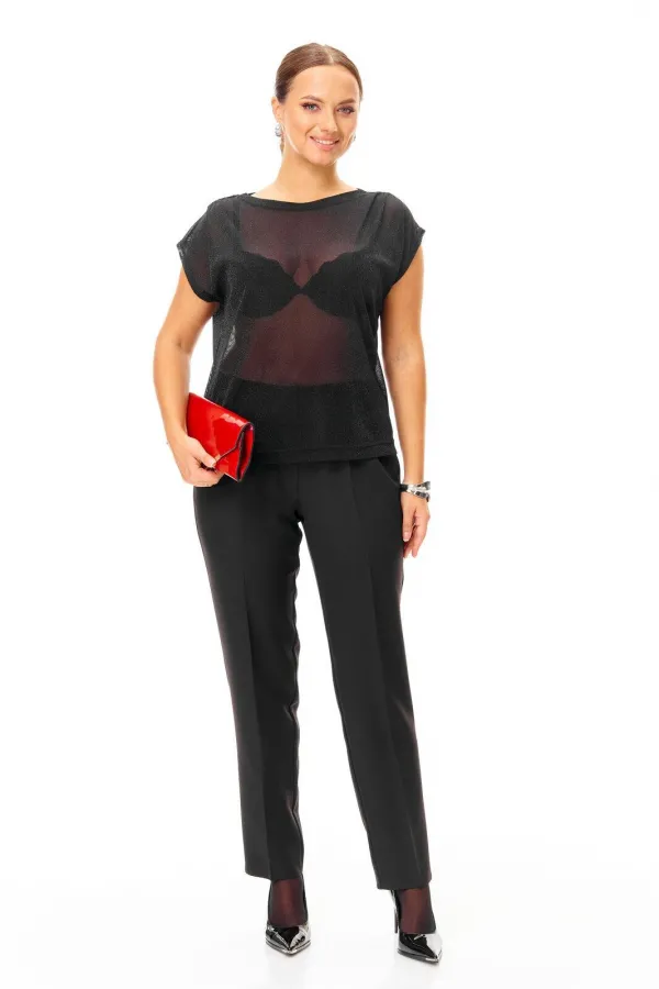 Полупрозрачная блузка из трикотажного полотна с овальной горловиной и коротким рукавом.