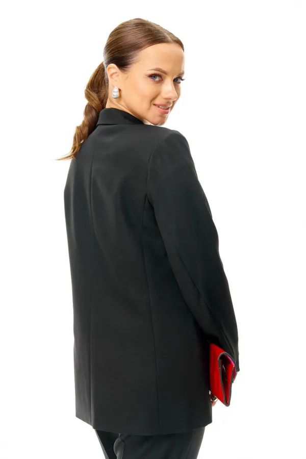 Свободный жакет с воротником и лацканами, застегивается на петли и пуговицы, с прорезными карманами по переду. Рукав длинный. Жакет по переду и спинке на подкладке.