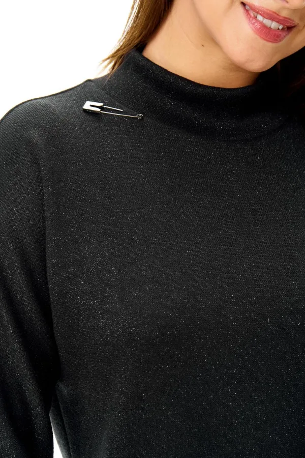 Джемпер свободного силуэта из однотонного трикотажного полотна с неярким блеском «люрекс». Горловина с невысокой «стойкой». Рукав цельнокроеный длинный с манжетой. По низу джемпера планка. Стильная брошь от сглаза. .