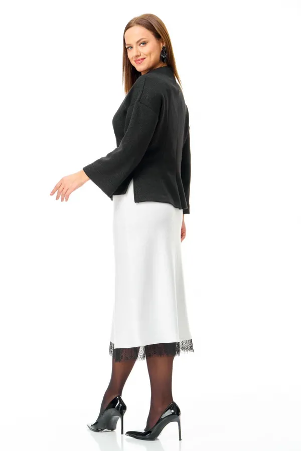 Классический черный трикотаж в сочетании с кружевом: слегка приталенный джемпер со съемными манжетами и юбка-midi.