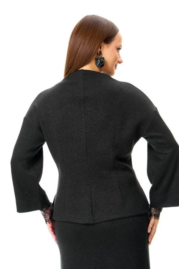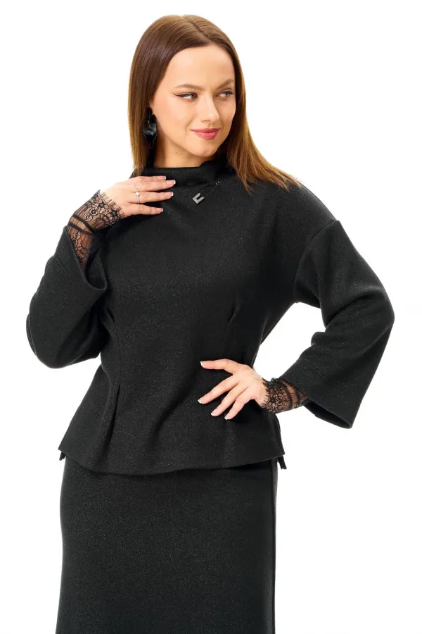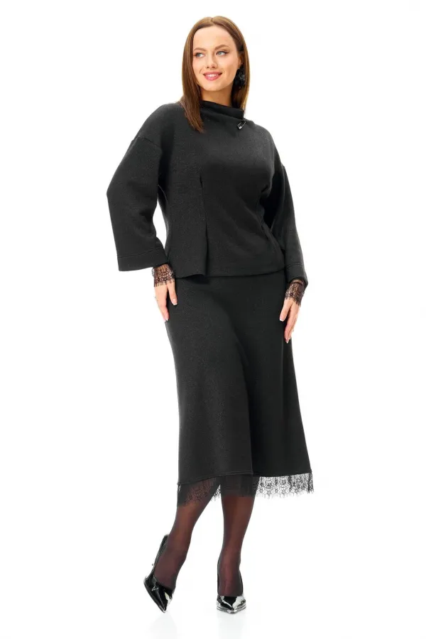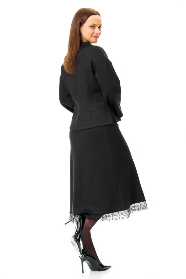 Классический черный трикотаж в сочетании с кружевом: слегка приталенный джемпер со съемными манжетами и юбка-midi.