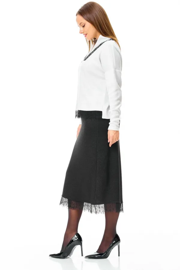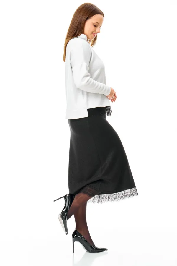 Юбка длиной midi слегка расширенная к низу, пояс на «резинке», без застежки. По низу юбки кружево. Юбка без подкладки.