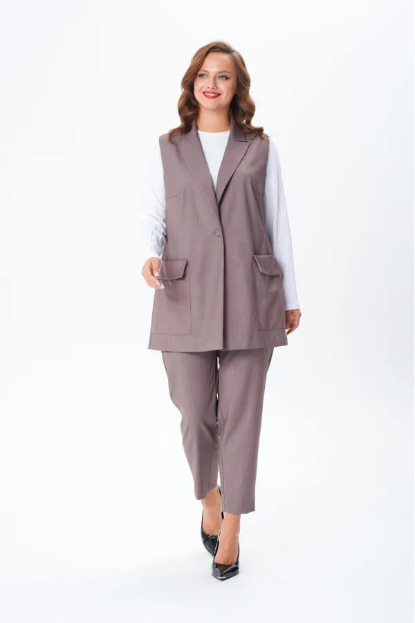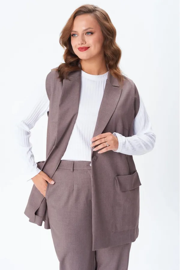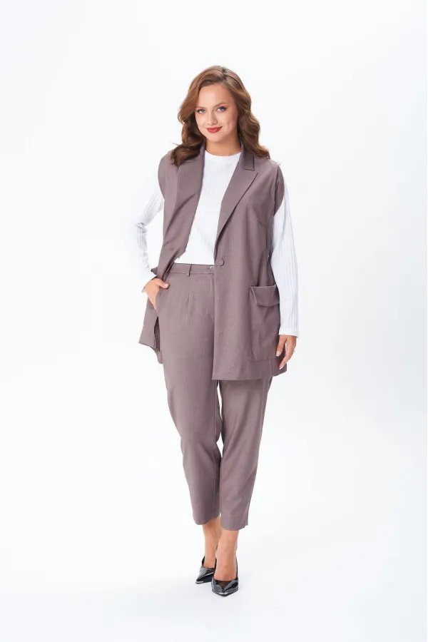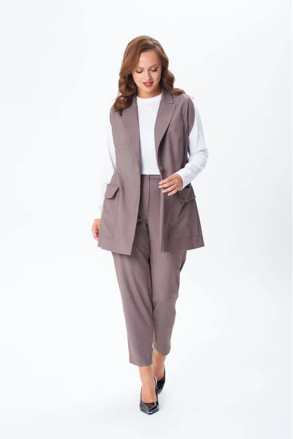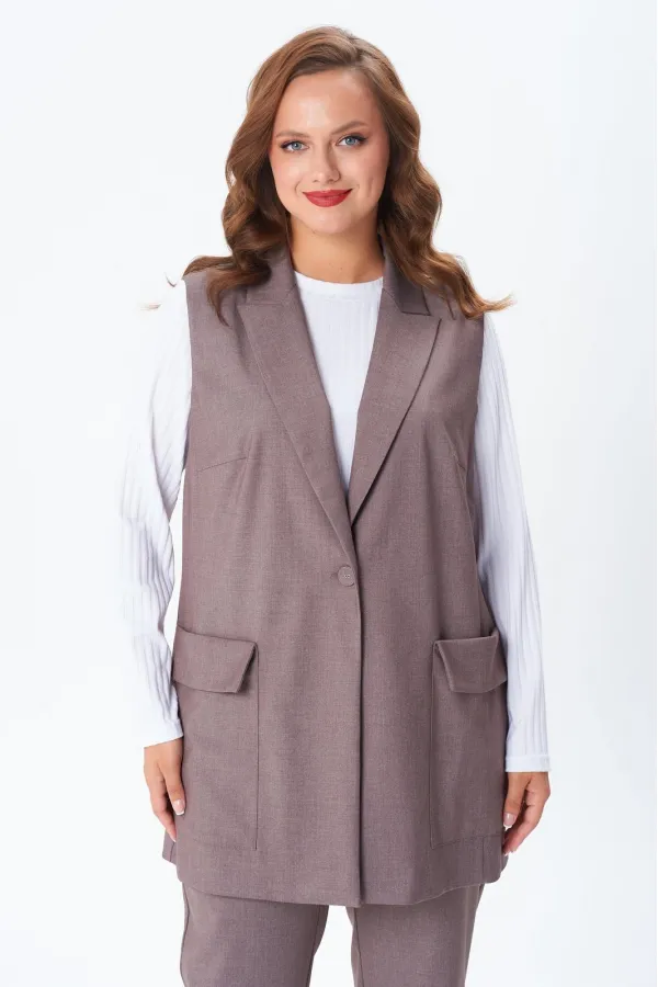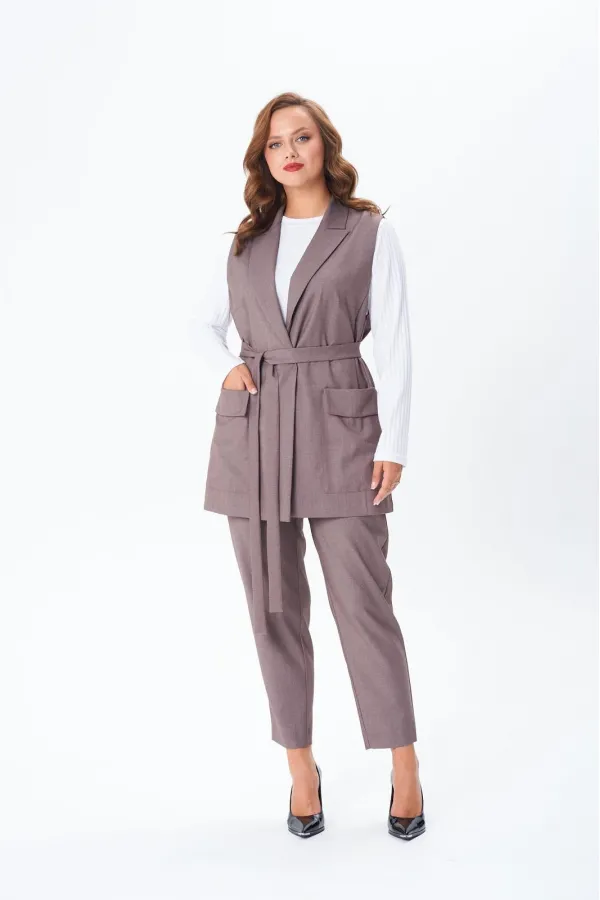 Комплект женский тройка состоит из жилета и брюк, выполнены из плательно-костюмной ткани, и лонгслива из трикотажного полотна «лапша». Жилет прямого силуэта, по переду центральная застежка на петлю и пуговицу, накладные ... Читать далее...