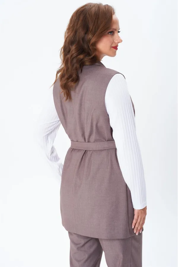 Комплект женский тройка состоит из жилета и брюк, выполнены из плательно-костюмной ткани, и лонгслива из трикотажного полотна «лапша». Жилет прямого силуэта, по переду центральная застежка на петлю и пуговицу, накладные карманы с отложным клапаном, нагрудные вытачки от вертикального рельефа. По спинке средний шов. Воротник пиджачного типа с лацканом. Брюки прямые классические на поясе с резинкой по спинке, шлевки. Карманы в боковых швах. По переду застежка с гульфиком. Лонгслив полуприлегающего силуэта. Перед и спинка цельные, рукав втачной длинный, горловина округлой формы, обработана планкой. В комплект входит сьемный пояс из основной ткани.