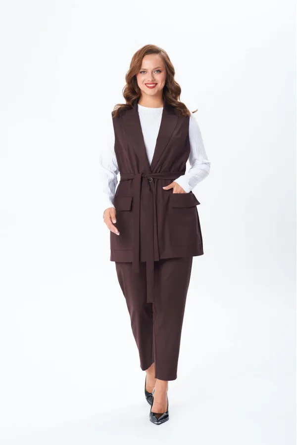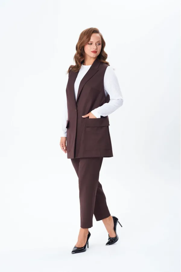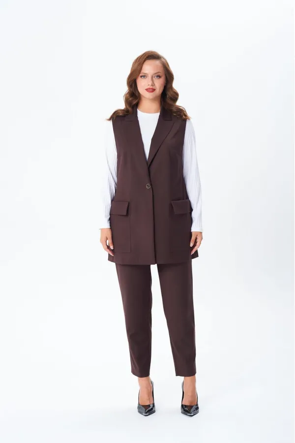 Комплект женский тройка состоит из жилета и брюк, выполнены из плательно-костюмной ткани, и лонгслива из трикотажного полотна «лапша». Жилет прямого силуэта, по переду центральная застежка на петлю и пуговицу, накладные ... Читать далее...