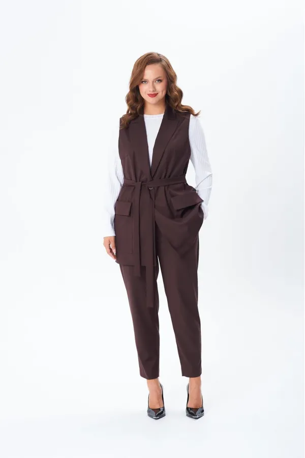 Комплект женский тройка состоит из жилета и брюк, выполнены из плательно-костюмной ткани, и лонгслива из трикотажного полотна «лапша». Жилет прямого силуэта, по переду центральная застежка на петлю и пуговицу, накладные карманы с отложным клапаном, нагрудные вытачки от вертикального рельефа. По спинке средний шов. Воротник пиджачного типа с лацканом. Брюки прямые классические на поясе с резинкой по спинке, шлевки. Карманы в боковых швах. По переду застежка с гульфиком. Лонгслив полуприлегающего силуэта. Перед и спинка цельные, рукав втачной длинный, горловина округлой формы, обработана планкой. В комплект входит сьемный пояс из основной ткани.
