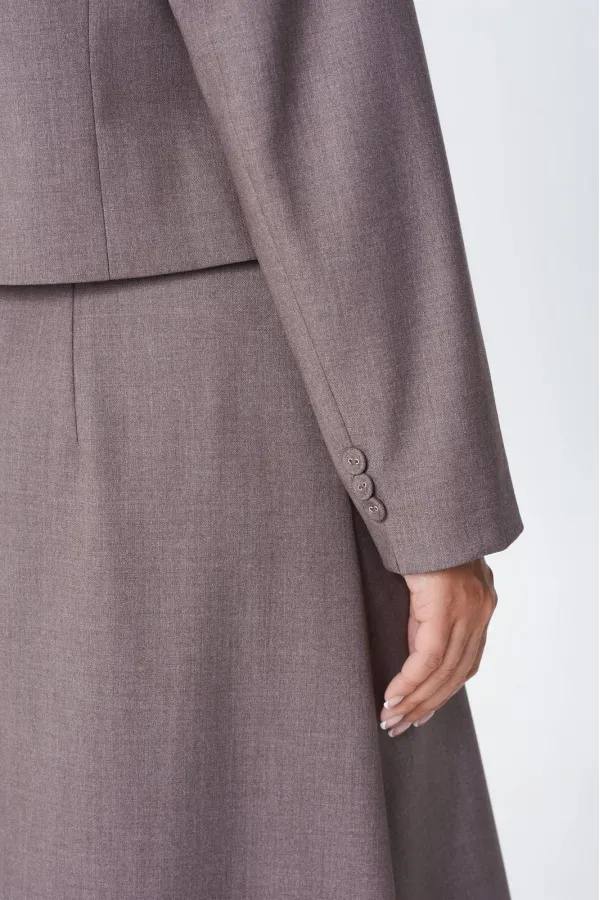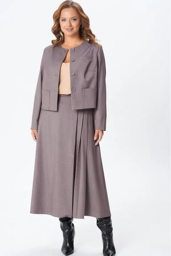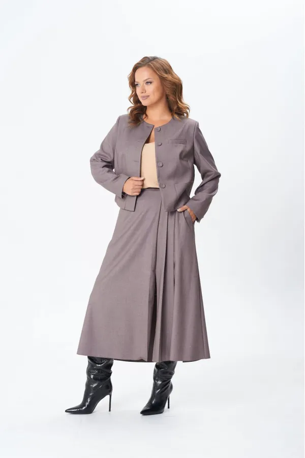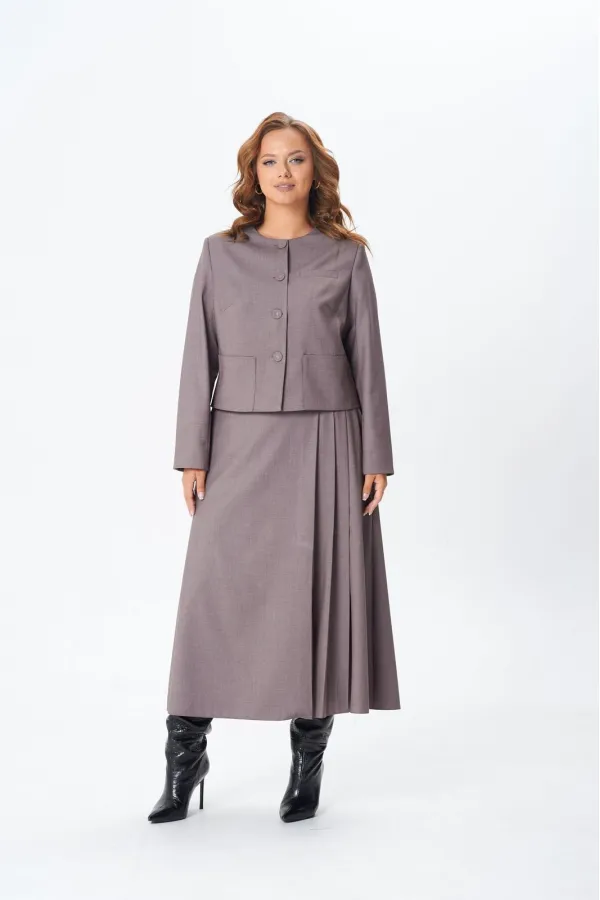 Комплект женский двойка состоит из укороченного жакета и юбки миди, выполнен из плательно-костюмной однотонной ткани, на подкладке. По переду жакета центральная застежка на петли и пуговицы, нагрудная вытачка от вертикального рельефа, накладные карманы, декоративный карман листочка. По спинке средний шов и вертикальный рельеф из проймы. Горловина округлой формы. Рукав двухшовный длинный, с небольшим разрезом внизу локтевого шва. Юбка расклешенная к низу, на подкладке, с поясом. По передней части ассиметрия: с левой стороны три складки, в одной из складок разрез. По задней части средний шов с застежкой на потайную молнию, в боковых швах функциональные карманы.