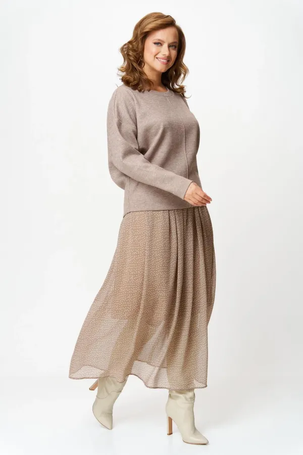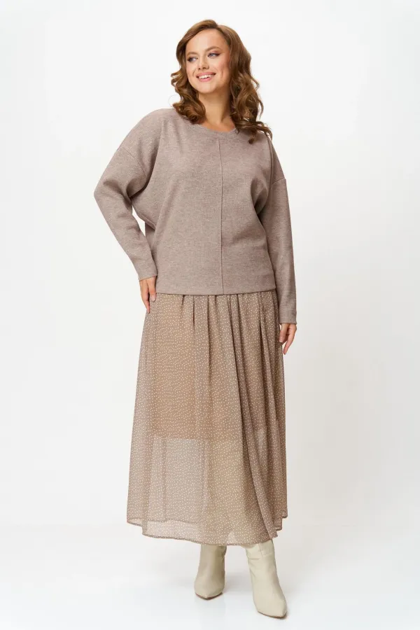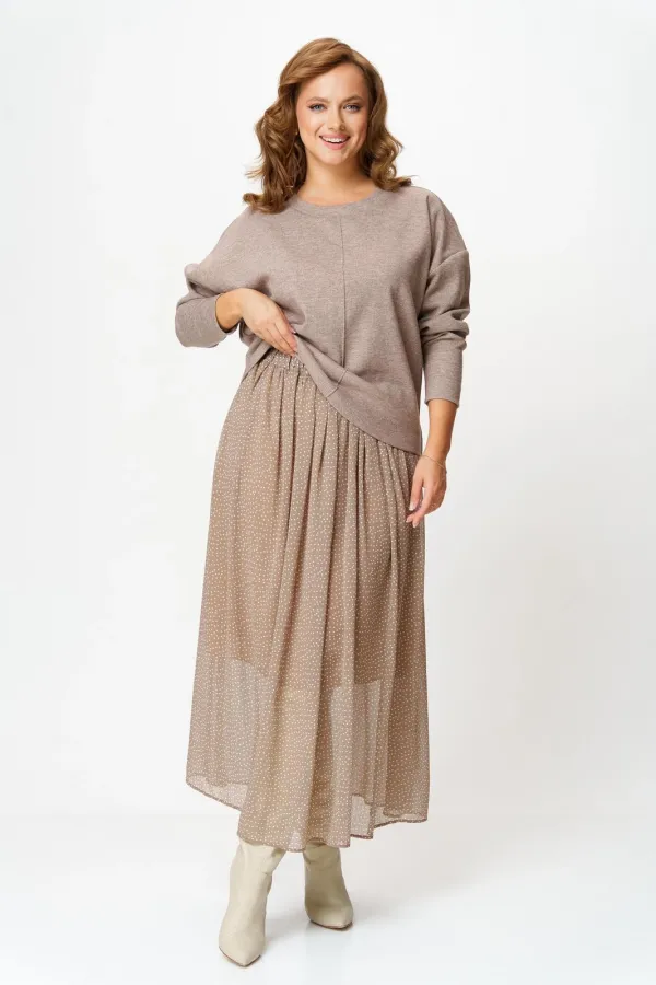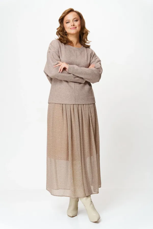Комплект женский состоит из джемпера и юбки. Джемпер трикотажный свободного покроя типа летучая мышь. По переду и спинке по центру вертикальный декоративный защип, который визуально вытягивает фигуру. Горловина округлой формы, обработана планкой из основной ткани. Юбка миди из шифона с принтом в мелкий горошек. Пояс на резинке. Юбка на подкладке.