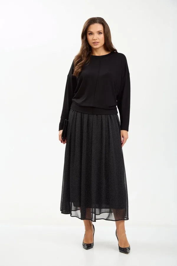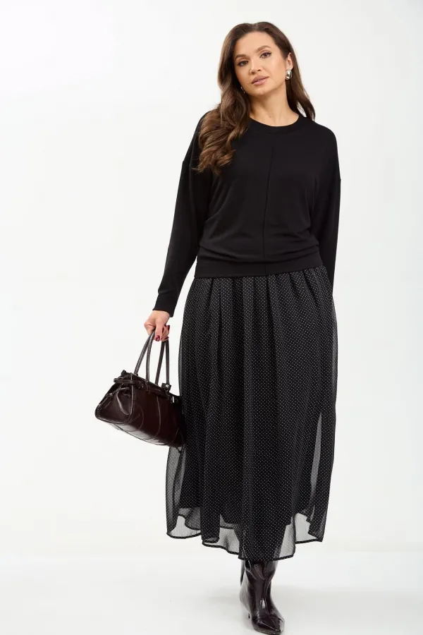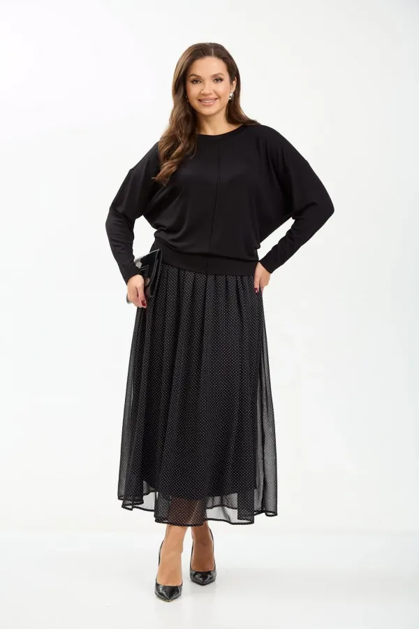 Комплект женский состоит из джемпера и юбки. Джемпер трикотажный свободного покроя типа летучая мышь. По переду и спинке по центру вертикальный декоративный защип, который визуально вытягивает фигуру. Горловина округлой формы, обработана планкой из основной ткани. Юбка миди из шифона с принтом в мелкий горошек. Пояс на резинке. Юбка на подкладке.
