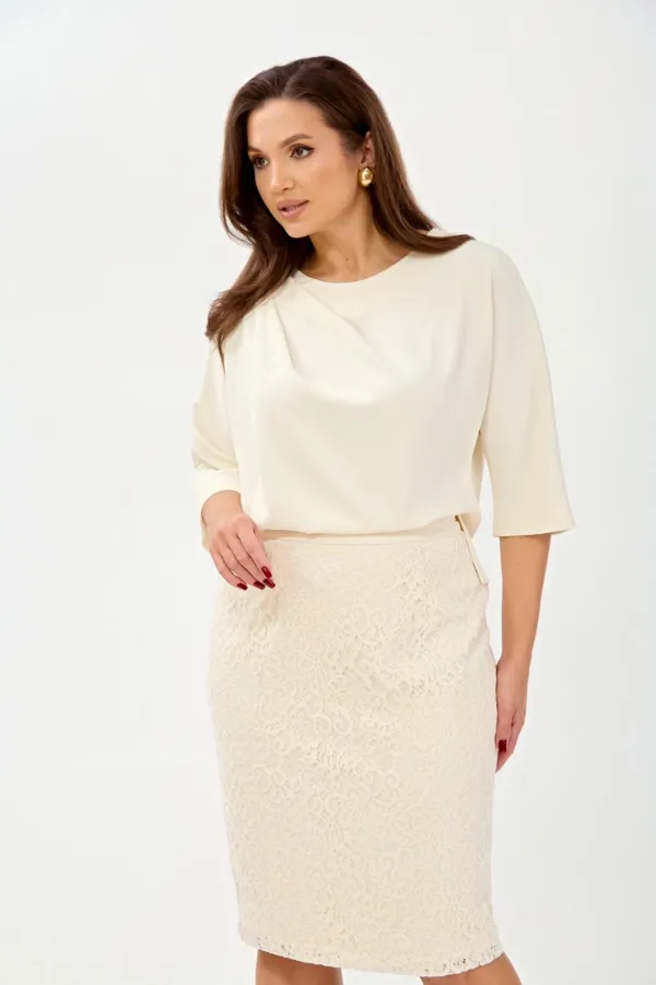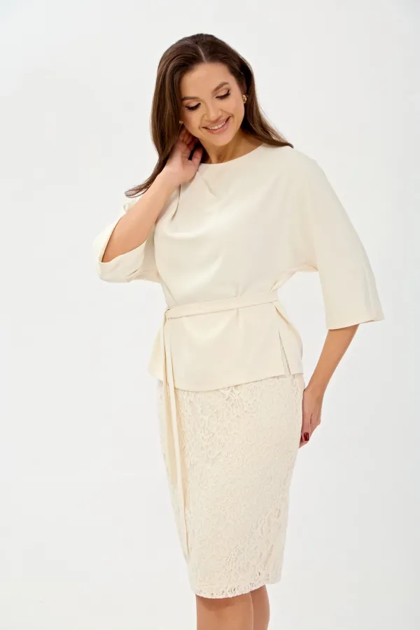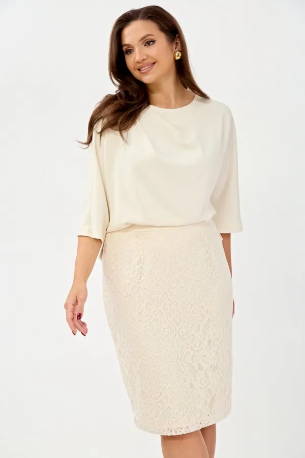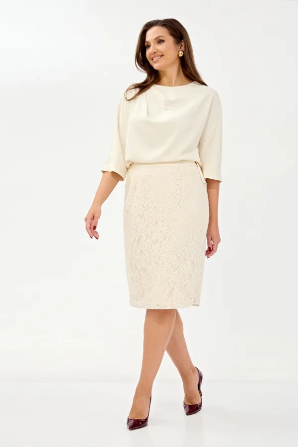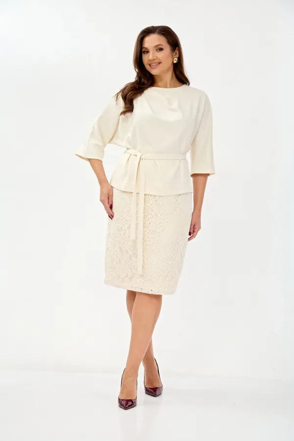 Комплект женский состоит из блузки и юбки. Блузка с цельнокроеным рукавом длиной 3/4. От правого плеча идут мягкие складки к центру переда. Застежка по центру спинки на петлю и пуговицу. По бокам небольшие разрезы. Блузка с поясом. Юбка на поясе выполнена из кружевного полотна на подкладке из основной ткани. На поясе по бокам эластичная тесьма. По среднему шву задней половинки юбки молния, снизу разрез 13,5 см.