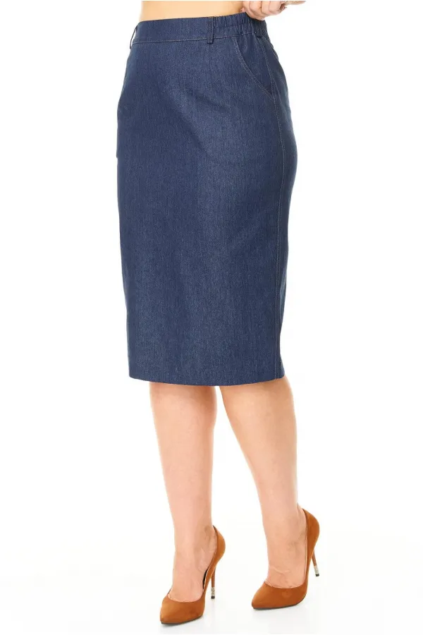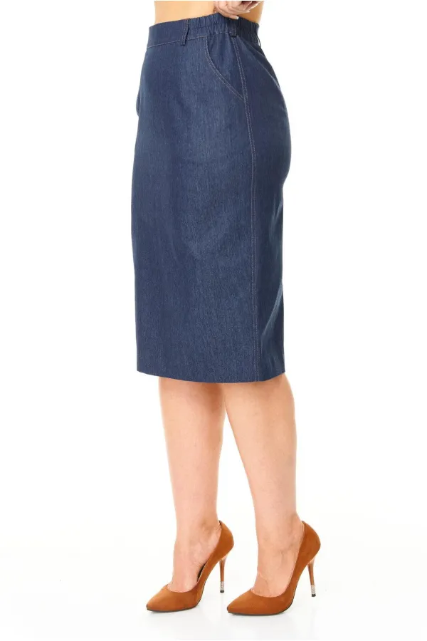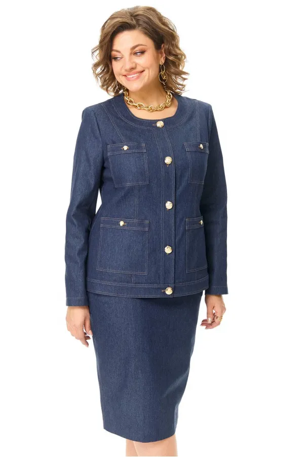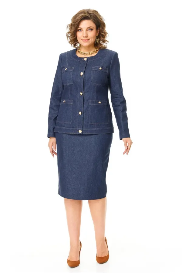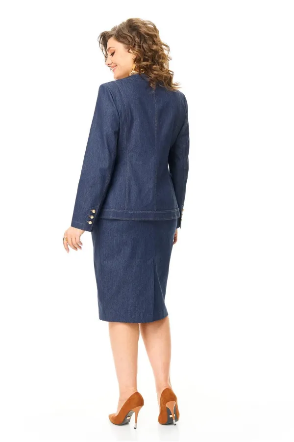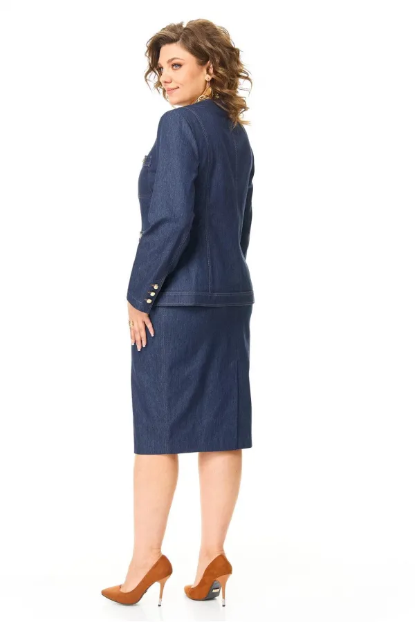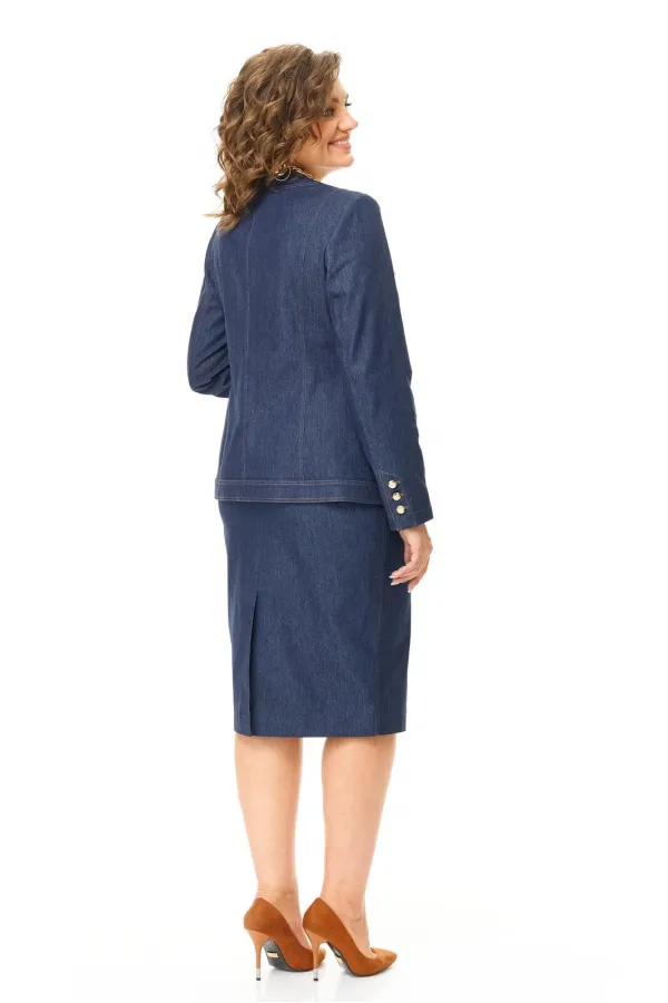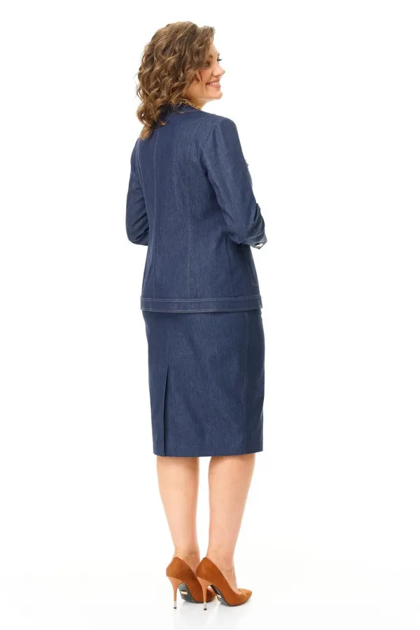 Костюм женский состоит из жакета и юбки. Жакет полуприлегающего силуэта с естественной линией плеча.Спинка со средним швом и рельефами из плеча.Перед с рельефами из плеча, с накладными карманами.Застежка центрально-бортовая на петлю-пуговицу.Воротник отложной пиджачного типа.Рукав втачной длинный.В локтевом шве рукава обработана отлетная шлица с отделочными пуговицами.Юбка зауженного силуэта типа карандаш.В среднем шве заднего полотнища застежка на потайную тесьму-молнию и шлица.В боковых швах карманы с отрезным бочком.Пояс притачной с резинкой в боковых швах.Отделочные строчки контрастного цвета.Вся фурнитура металлическая premium качества.