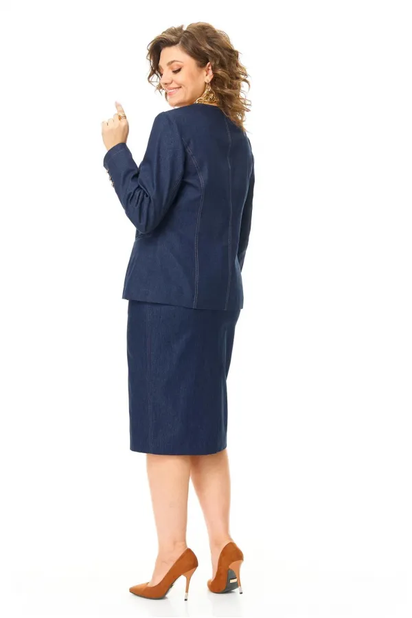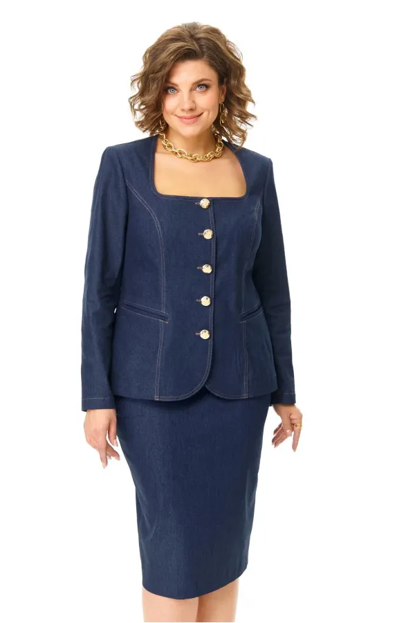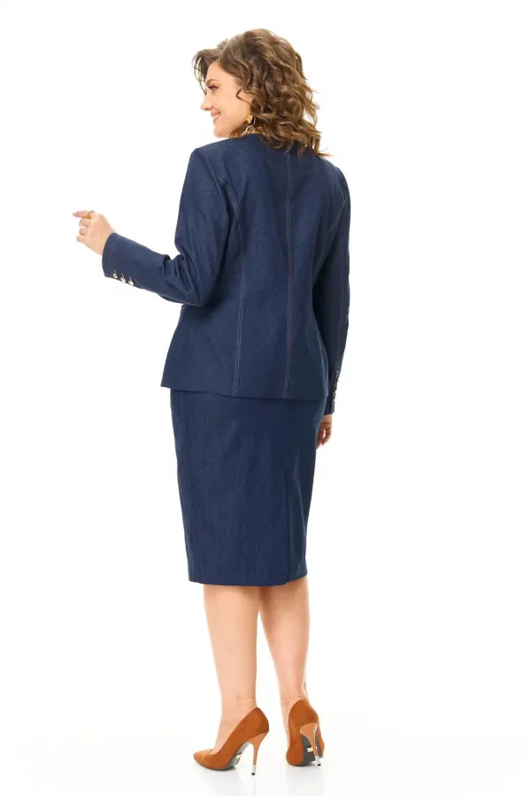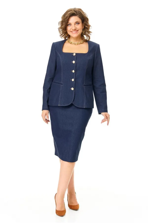 Костюм женский состоит из жакета и юбки. Жакет полуприлегающего силуэта с естественной линией плеча.Спинка со средним швом и рельефами из плеча.Перед с рельефами из плеча и прорезными карманами.Застежка центрально-бортовая на петлю-пуговицу.Горловина углубленная авторской формы.Рукав втачной длинный.В локтевом шве рукава обработана отлетная шлица с отделочными пуговицами.Юбка зауженного силуэта типа карандаш.В среднем шве заднего полотнища застежка на потайную тесьму-молнию и шлица.В боковых швах карманы с отрезным бочком.Пояс притачной с резинкой в боковых швах.Отделочные строчки контрастного цвета.Вся фурнитура металлическая premium качества.