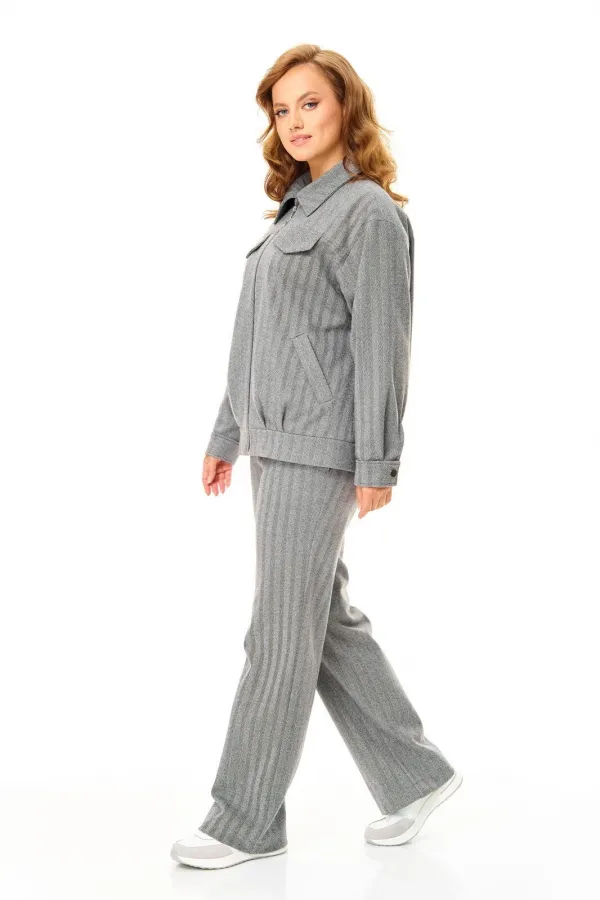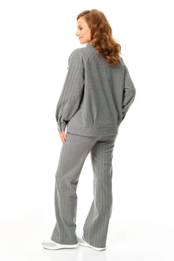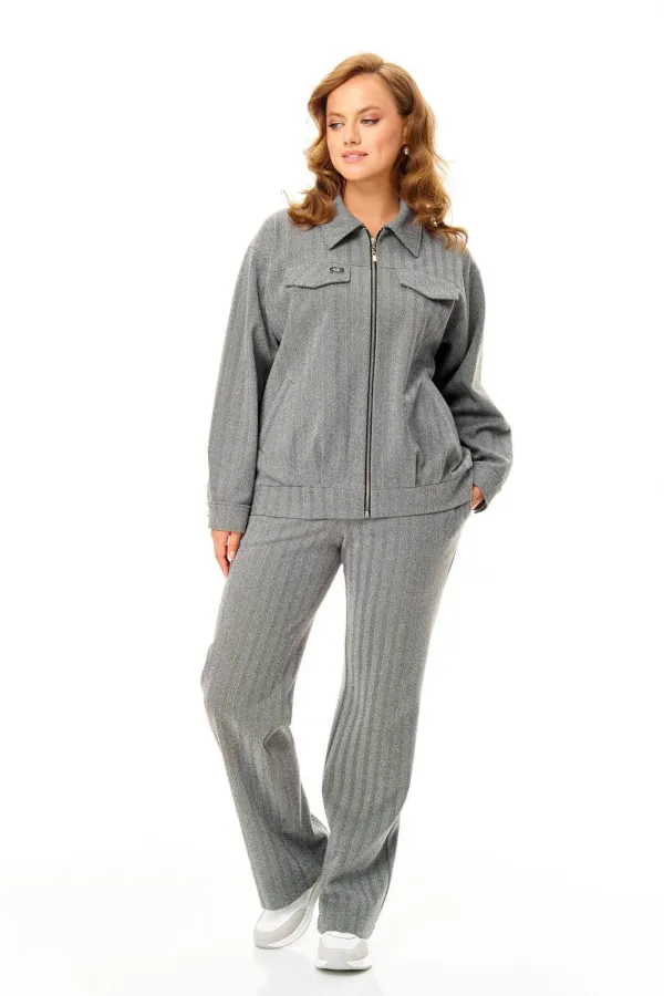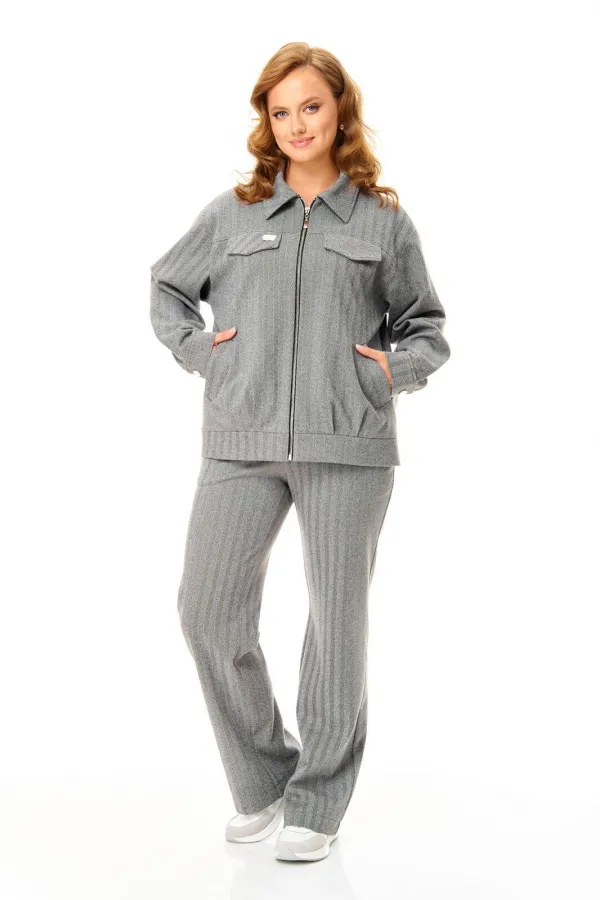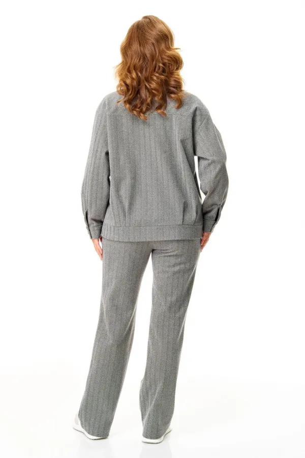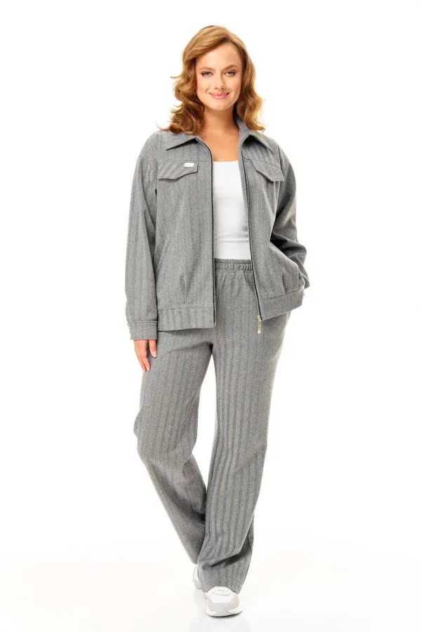 Комплект женский состоит из бомбера и брюк. Бомбер прямого свободного покроя со спущенной линией плеча на подкладке.По переду обработаны кокетки с клапанами и прорезные карманы с листочкой.Застежка центральная бортовая на металлическую тесьму молнию.На спинке обработана отрезная кокетка.По низу бомбера притачной пояс.На спинке и переде в шве притачивания пояса, заложены лёгкие односторонние складки.Воротник отложной.Рукав рубашечного покроя, полноценной длины.Низ рукава обработан притачной манжетой с застежкой на кнопку.На одном из клапанов имеется декоративная нашивка.Брюки свободные прямого силуэта.Пояс притачной на резинке.В боковых швах карманы.