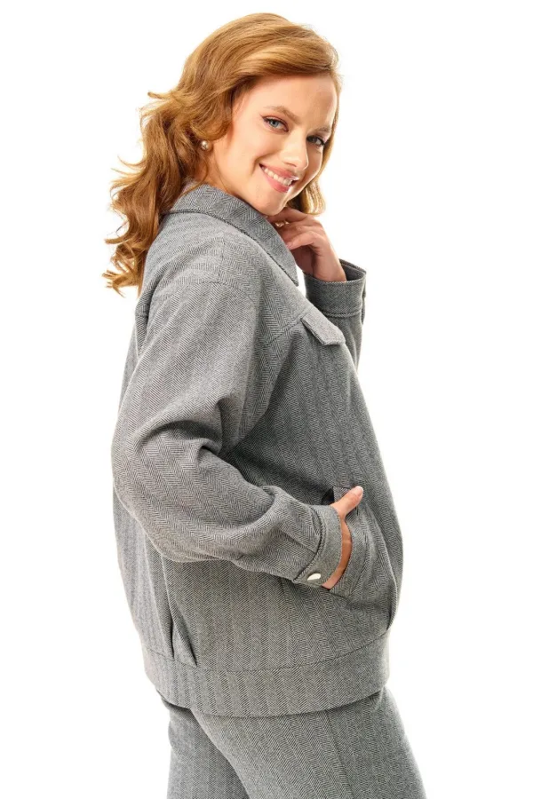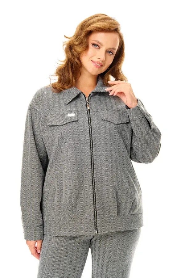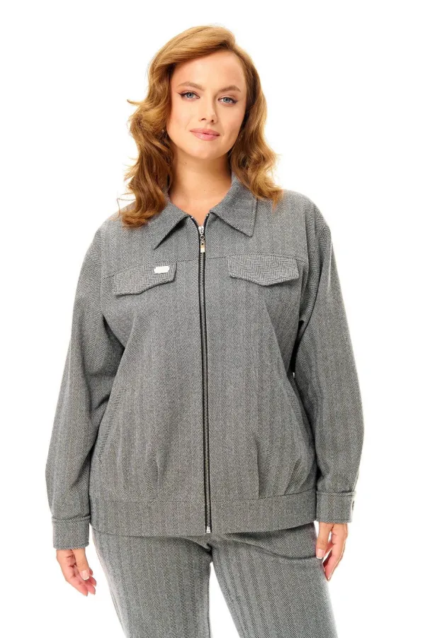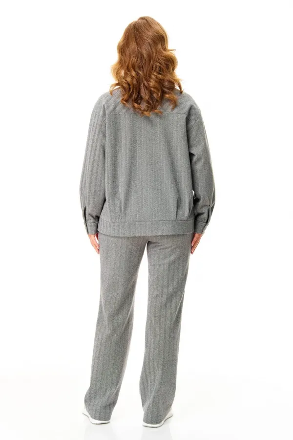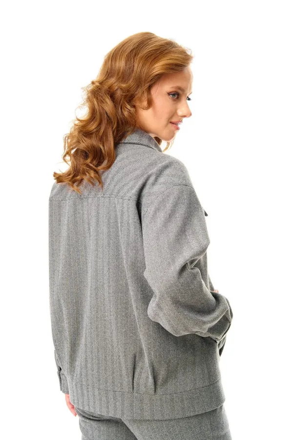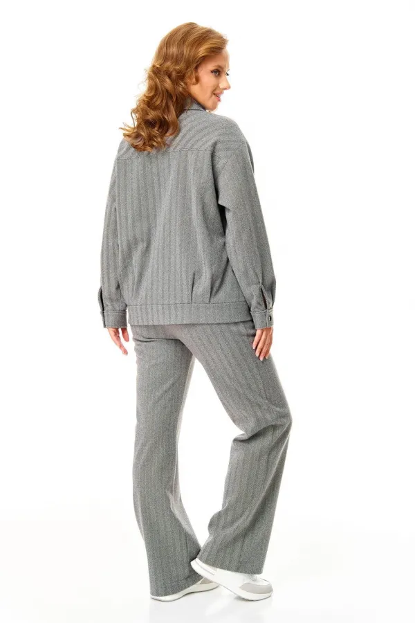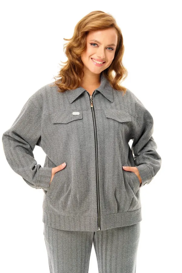 Комплект женский состоит из бомбера и брюк. Бомбер прямого свободного покроя со спущенной линией плеча на подкладке.По переду обработаны кокетки с клапанами и прорезные карманы с листочкой.Застежка центральная бортовая на металлическую тесьму молнию.На спинке обработана отрезная кокетка.По низу бомбера притачной пояс.На спинке и переде в шве притачивания пояса, заложены лёгкие односторонние складки.Воротник отложной.Рукав рубашечного покроя, полноценной длины.Низ рукава обработан притачной манжетой с застежкой на кнопку.На одном из клапанов имеется декоративная нашивка.Брюки свободные прямого силуэта.Пояс притачной на резинке.В боковых швах карманы.