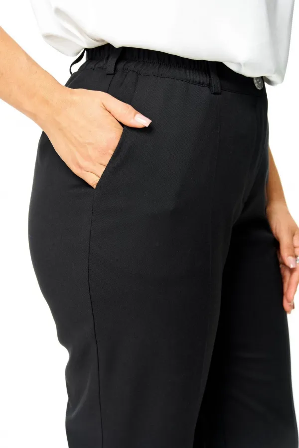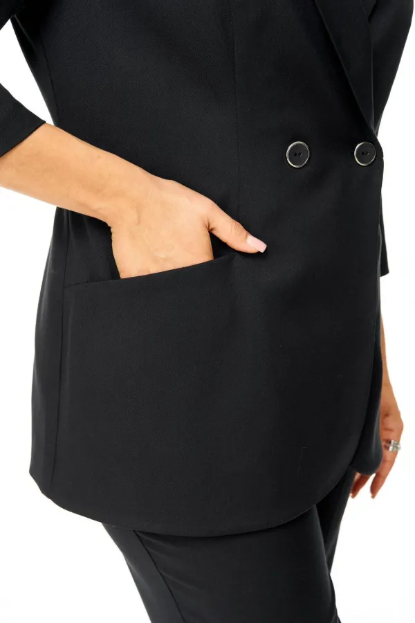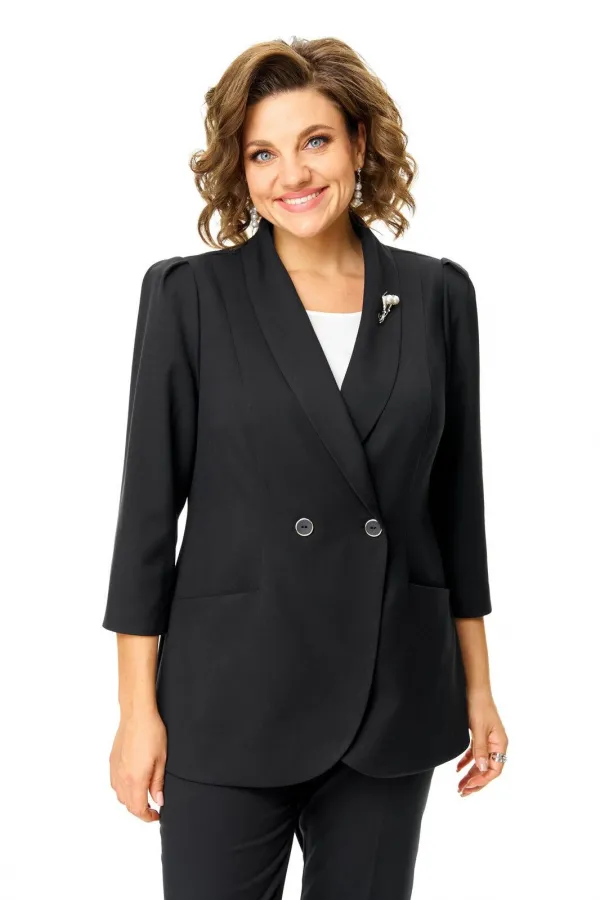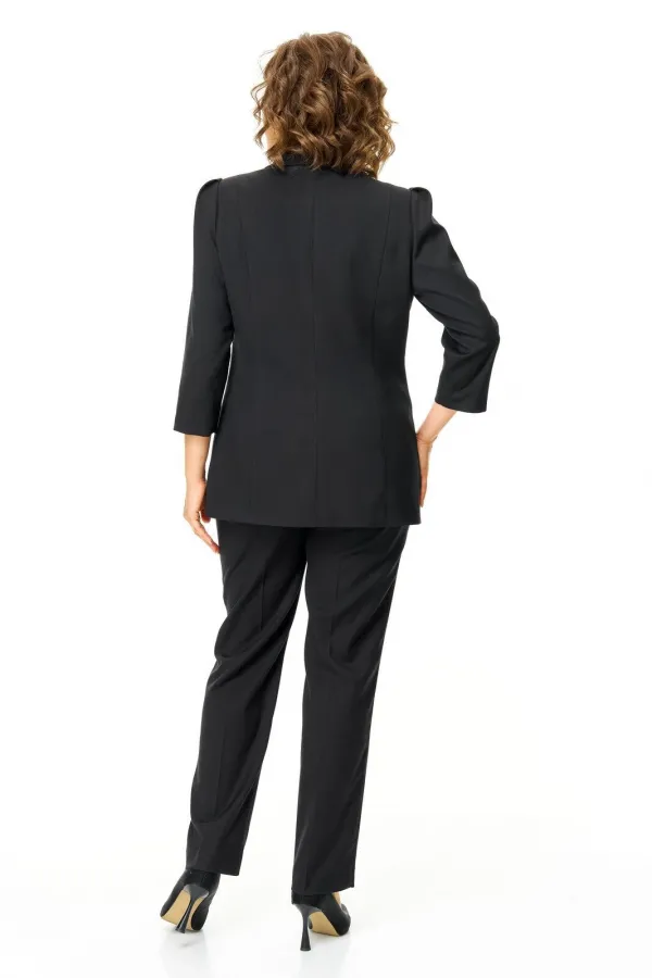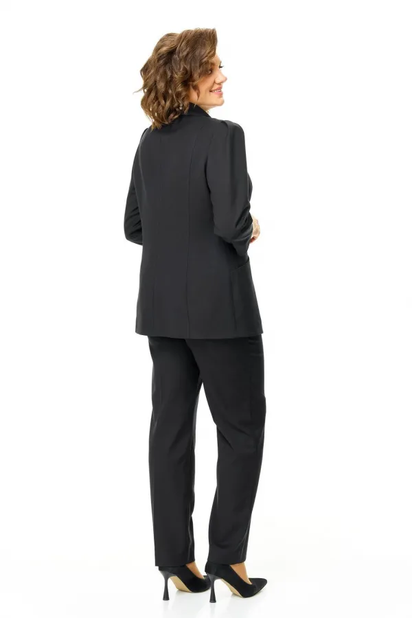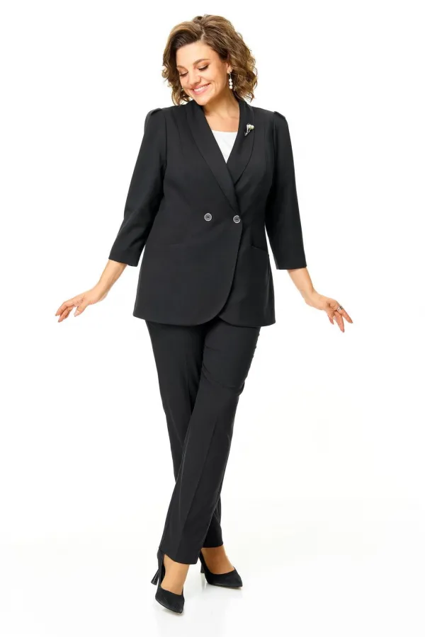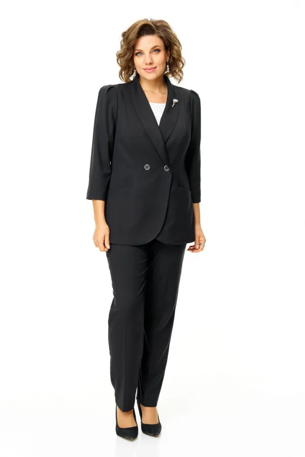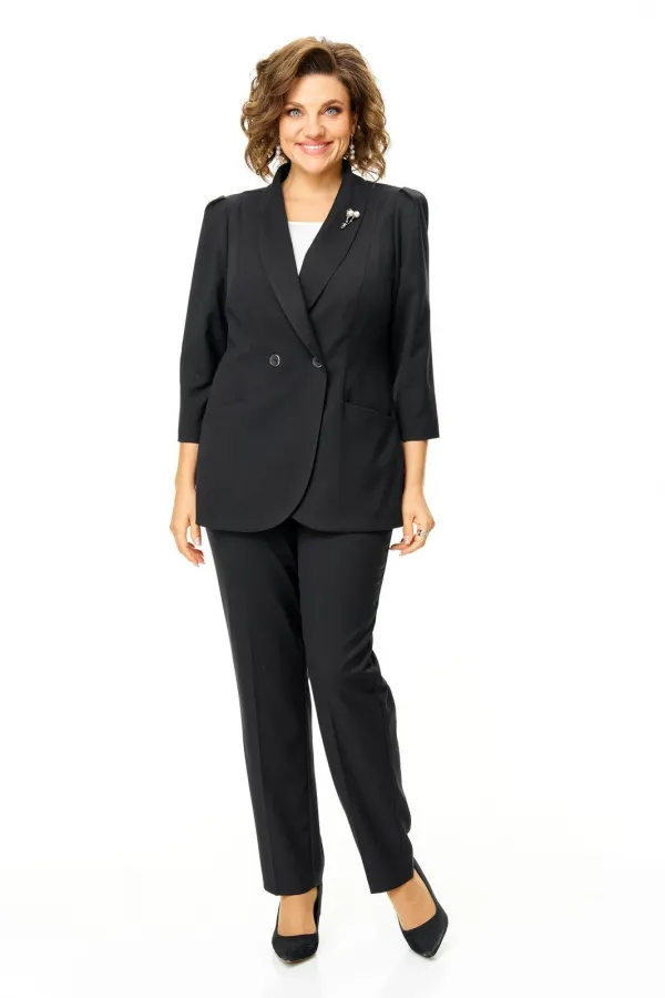 Костюм женский состоит из жакета и брюк.Жакет полуприлегающего покроя с зауженной линией плеча на подкладке.Застежка двубортная петли-пуговицы.По спинке и переду обработаны рельефы выходящие из плеча.Низ борта округлой формы.Воротник типа шаль.По переду обработаны карманы в подрезах.Рукав длиной 3/4 со складками по окату.Брюки зауженные к низу, с центральной застёжкой на молнию и петлю-пуговицу.В боковых швах карманы с отрезным бочком.Пояс притачной с резинкой по бокам.В комплект входит съёмная металлическая брошь.