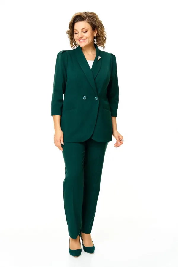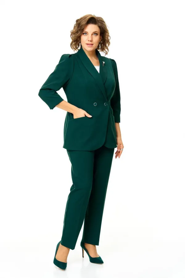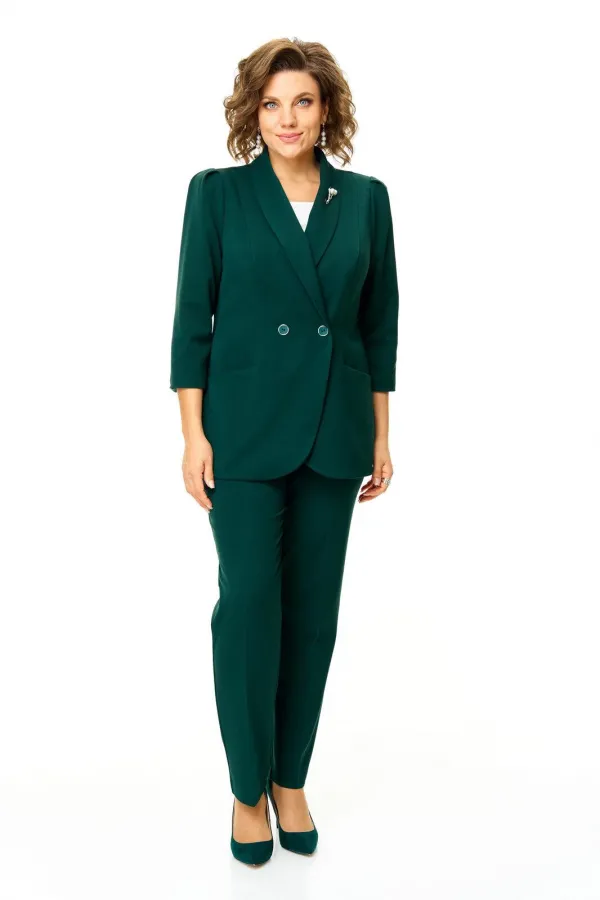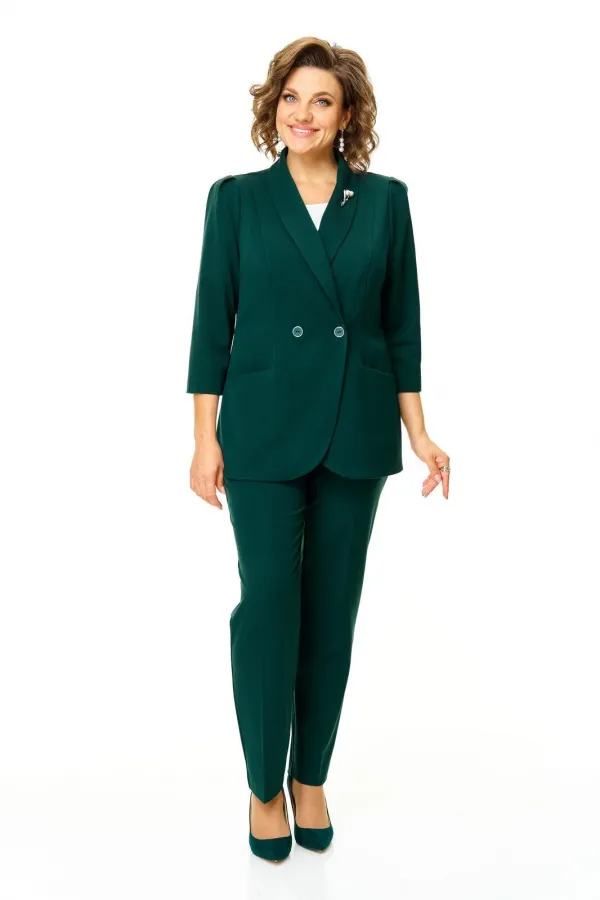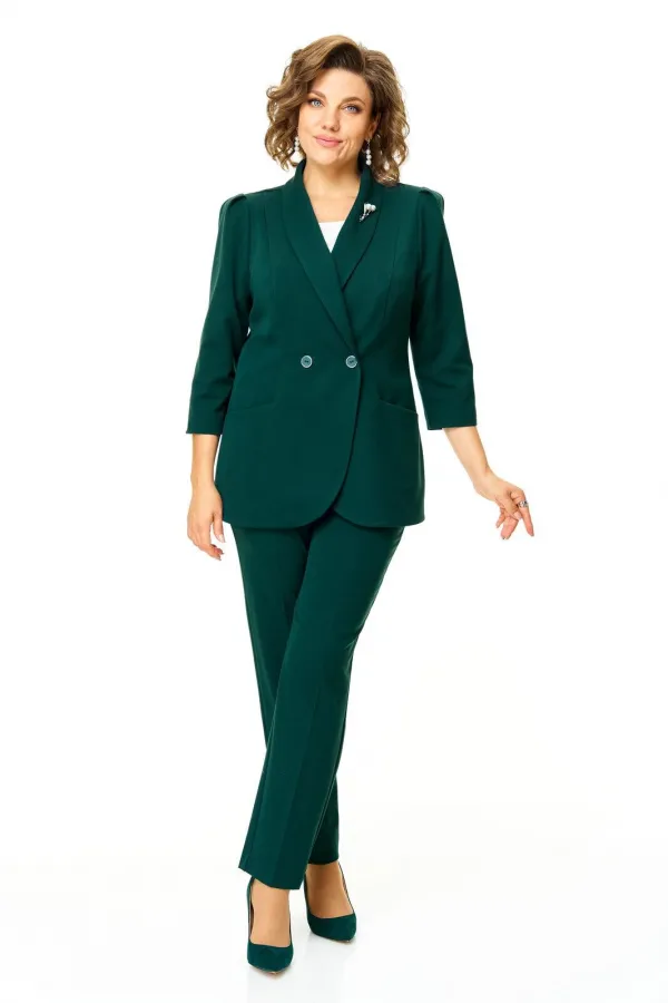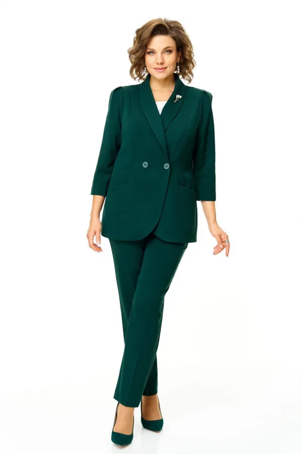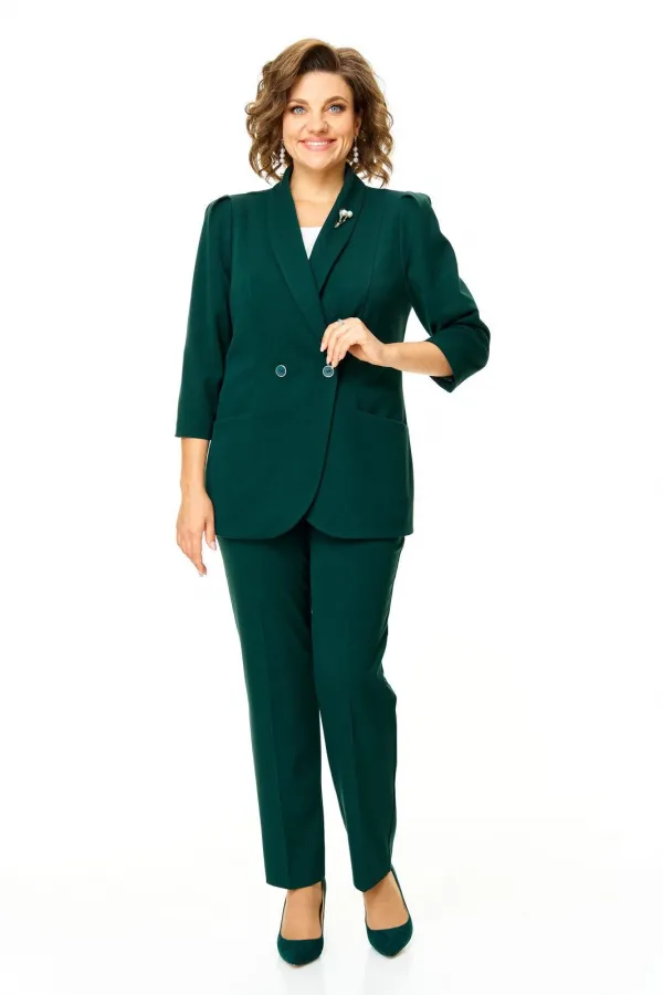 Костюм женский состоит из жакета и брюк.Жакет полуприлегающего покроя с зауженной линией плеча на подкладке.Застежка двубортная петли-пуговицы.По спинке и переду обработаны рельефы выходящие из плеча.Низ борта округлой формы.Воротник типа шаль.По переду обработаны карманы в подрезах.Рукав длиной 3/4 со складками по окату.Брюки зауженные к низу, с центральной застёжкой на молнию и петлю-пуговицу.В боковых швах карманы с отрезным бочком.Пояс притачной с резинкой по бокам.В комплект входит съёмная металлическая брошь.