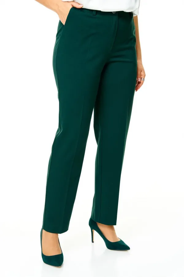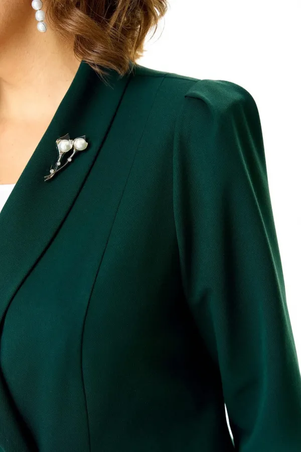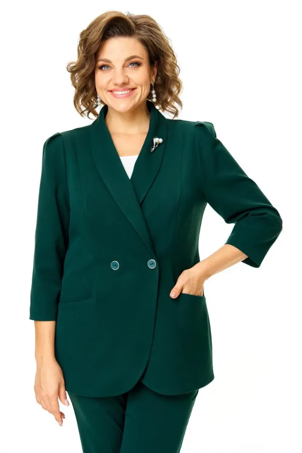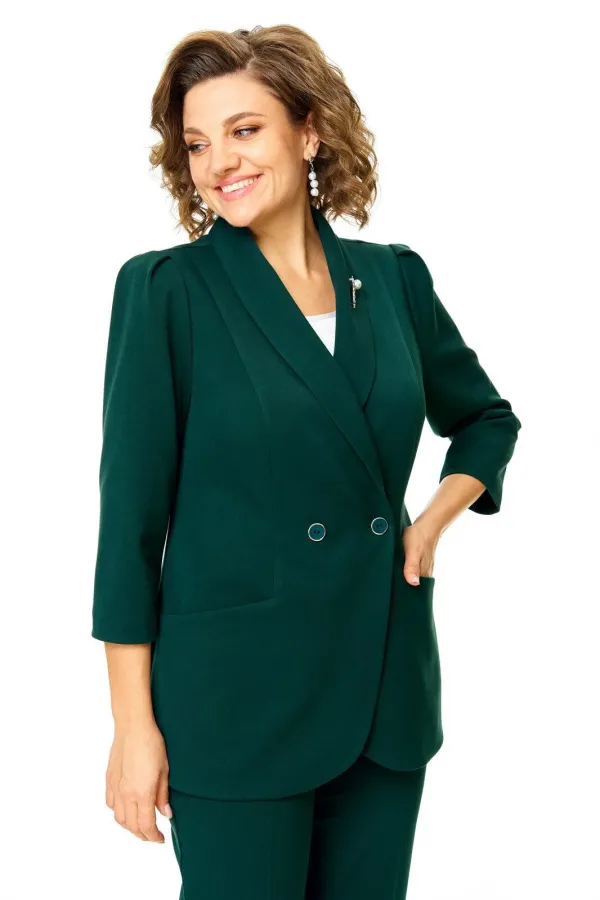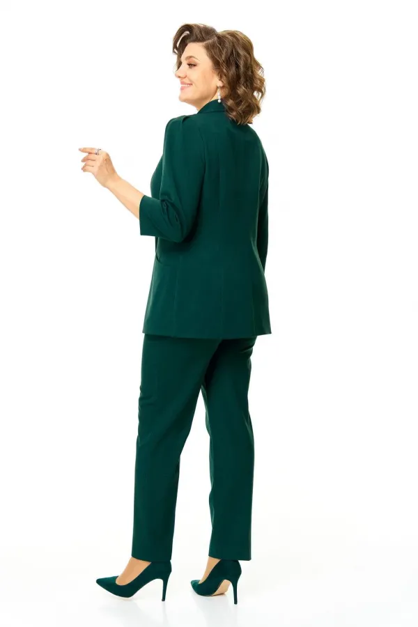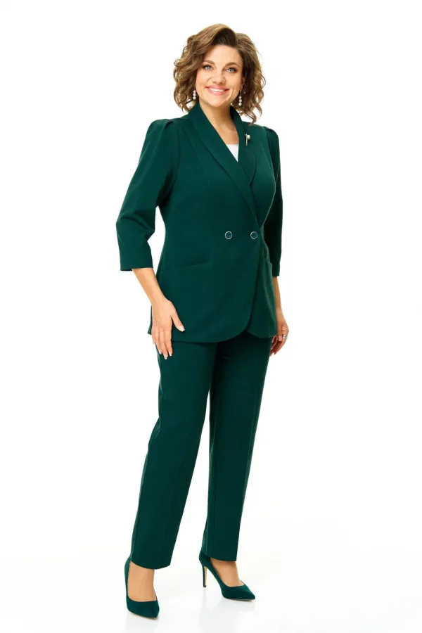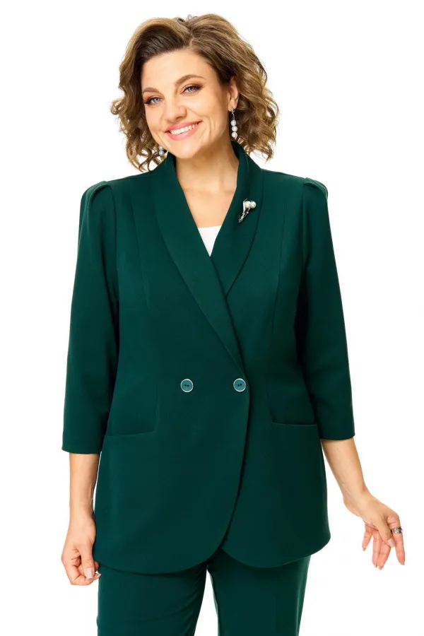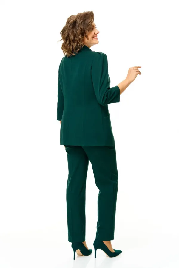 Костюм женский состоит из жакета и брюк.Жакет полуприлегающего покроя с зауженной линией плеча на подкладке.Застежка двубортная петли-пуговицы.По спинке и переду обработаны рельефы выходящие из плеча.Низ борта округлой формы.Воротник типа шаль.По переду обработаны карманы в подрезах.Рукав длиной 3/4 со складками по окату.Брюки зауженные к низу, с центральной застёжкой на молнию и петлю-пуговицу.В боковых швах карманы с отрезным бочком.Пояс притачной с резинкой по бокам.В комплект входит съёмная металлическая брошь.