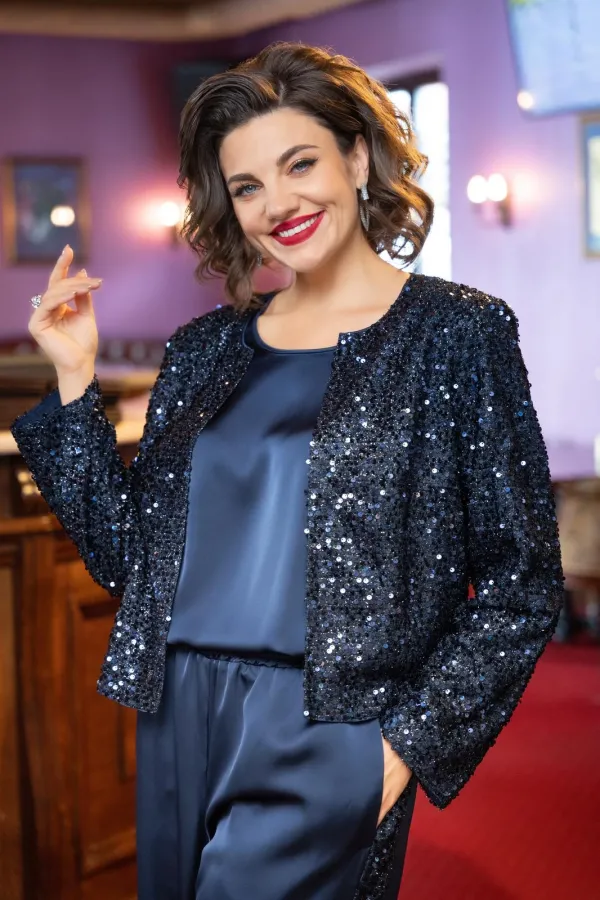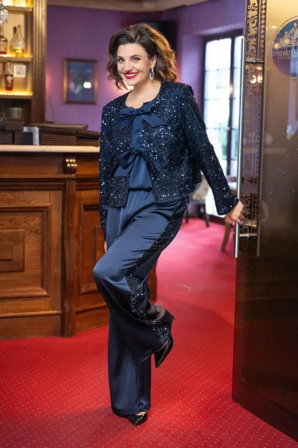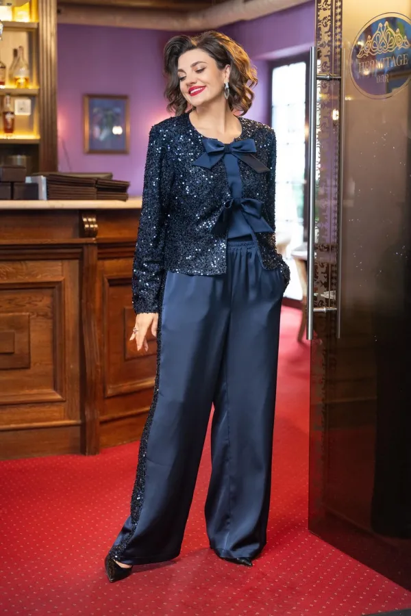Комплект женский состоит из жакета, топа и брюк.Жакет прямого силуэта свободного покроя с естественной линией плеча на подкладке из атласной ткани.Горловина округлой формы.Застежка на съемные декоративные авторские банты с применением потайного крепления на небольшие кнопки, для возможности создания различных образов, как с бантами, так и без них.Топ свободного покроя.Горловина округлой формы.Проймы и горловина окантованы.Брюки свободные расширенного силуэта.По бокам выполнены лампасы из полотна с пайетками.Пояс притачной на резинке.В боковых швах карманы.