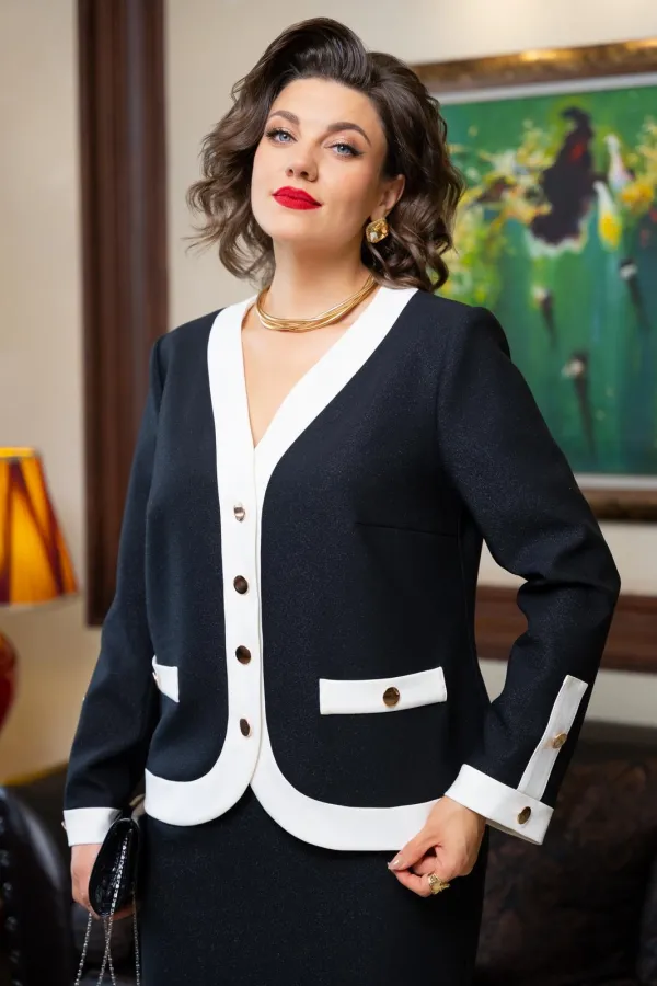Костюм женский состоит из жакета и юбки. Жакет свободного покроя с естественной линией плеча на подкладке.Спинка со средним швом.Перед с нагрудными вытачками и настроченными листочками.По переду обработана отрезная планка плавно переходящая в борт и горловину.Вырез горловины V-образной формы.Борта жакета закруглённые.Застежка центрально-бортовая на петли-пуговицы.Рукав двухшовный длинный с отрезной манжетой и настроченной планкой.Юбка на подкладке зауженного силуэта типа карандаш. В среднем шве заднего полотнища застежка на потайную тесьму-молнию и шлица.Пояс притачной с резинкой в боковых швах.Вся фурнитура металлическая premium качества.