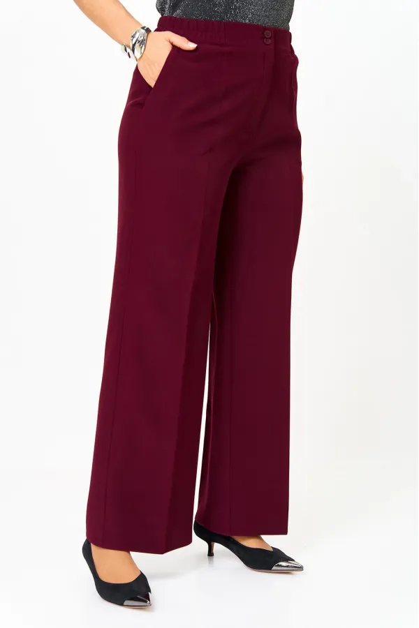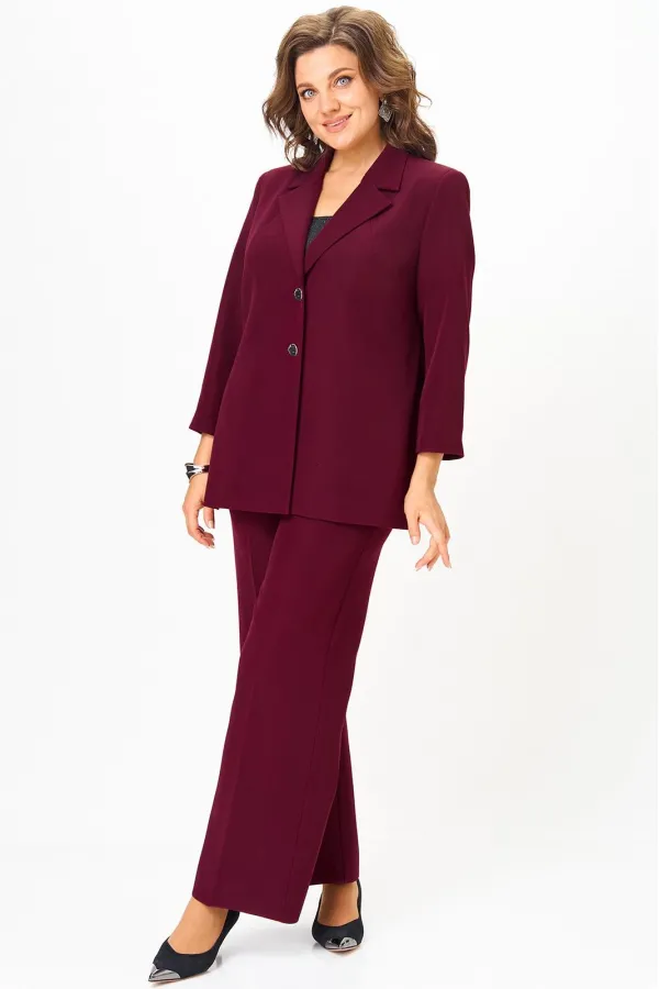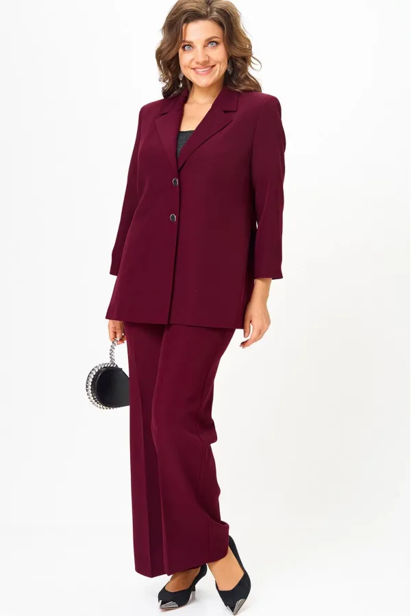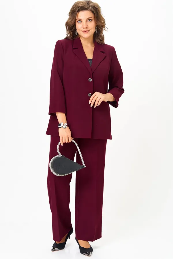 Костюм женский двухпредметный, состоящий из жакета и брюк. Жакет полуприлегающего силуэта, удлиненный, с центральной бортовой застежкой на 2 петли-пуговицы до линии перегиба лацкана. Перед с нагрудными вытачками, выходящими из горловины. Боковые швы с разрезами, между которыми по спинке вставлен пояс фигурной формы с декоратичной нашивкой. Спинка со средним швом. Воротник пиджачного типа. Рукава втачные двухшовные длиной 3/4. Брюки палаццо с притачным широким поясом на резинке от заутюженных стрелок по передней половинке вкруговую. Застежка на тесьму-молнию в средних срезах передних половинок брюк и 2 петли-пуговицы по поясу.