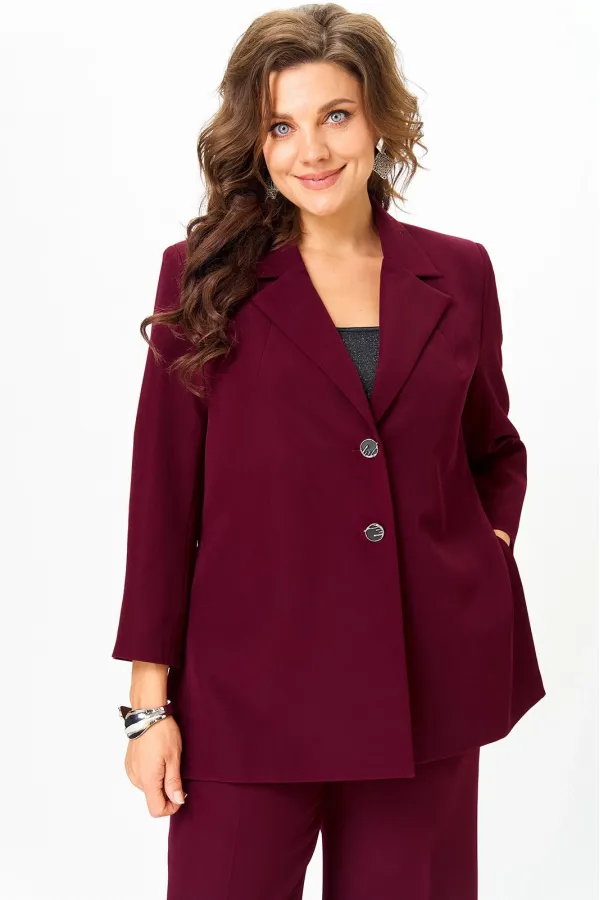 Костюм женский двухпредметный, состоящий из жакета и брюк. Жакет полуприлегающего силуэта, удлиненный, с центральной бортовой застежкой на 2 петли-пуговицы до линии перегиба лацкана. Перед с нагрудными вытачками, выходящ... Читать далее...