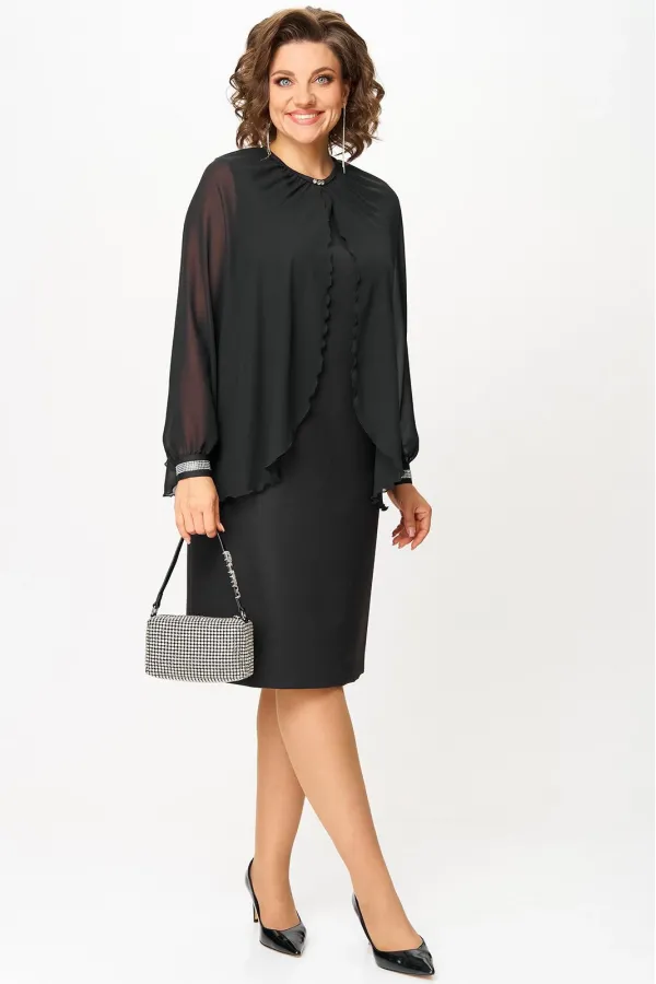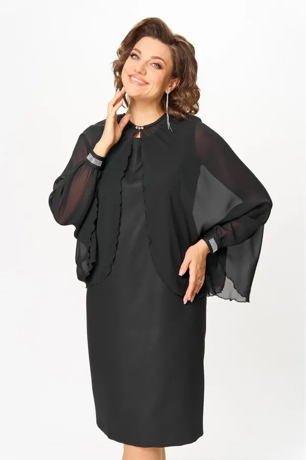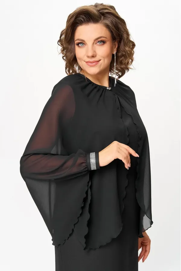 Комплект женский двухпредметный, состоящий из платья и болеро. Платье полуприлегающего силуэта, зауженное к низу. С кокетками и нагрудными вытачками, выходящими из пройм. Спинка со средним швом, в котором обработана шлица и застежка на потайную тесьму-молнию. Болеро из шифона с овальной присборенной горловиной, обработанной бейкой, украшенной по переду пришивными камнями, а сзади застегивающейся навесной петлей и пуговицей. В болеро цельнокроенные со спинкой и передом длинные рукава, заканчивающиеся манжетой с петлей и пуговицей и стыкующиеся по центру переда и спинки. Фигурные края изделия обработаны на флеш.