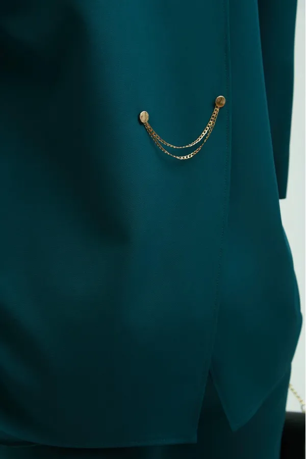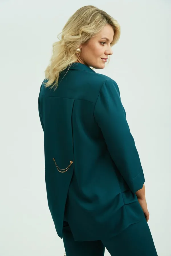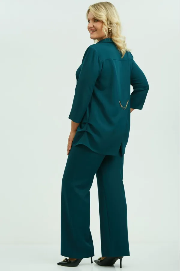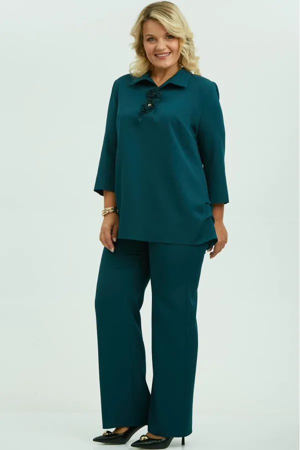 Костюм женский двухпредметный, состоящий из туники и брюк. Туника прямого силуэта со складками в боковых швах, нагрудными вытачками, выходящими из боковых швов, и застежкой на планке на 2 петли-пуговицы, деворированной двумя рюшами-розами. Воротник отложной. Спинка с горизонтальной кокеткой, нижние отлетные детали спинки фигурной формы на запах, декорированные пуговицами с цепочкой. Рукав втачной прямой одношовный длиной 3/4. Брюки прямого кроя с заутюженными стрелками и с притачным поясом от середины передних половинок с резинкой вкруговую. Застежка на тесьму-молнию и 1 петлю-пуговицу по поясу.