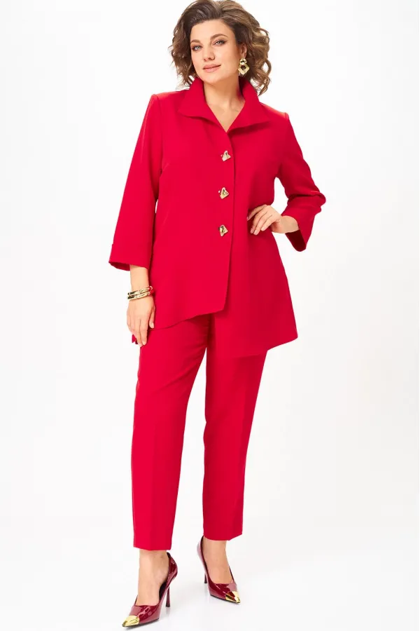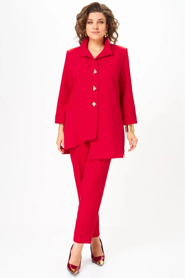 Комплект женский, состоящий из туники и брюк. Туника А-образного силуэта с центральной застежкой на планку до подреза на 3 декоративные петли-пуговицы. Перед с нагрудной вытачкой и фигурными подрезами. Спинка с горизонтальной кокеткой и двумя складками. В боковых швах обработаны разрезы. Низ переда ассиметричен и слегка разведен. Рукава втачные одношовные длиной 3/4 с защипом, имитирующим манжет. Воротник-стойка. Брюки классического кроя, зауженные к низу с притачным поясом сзади на резинке. Застежка на тесьму-молнию в среднем шве передних половинок и 1 петлю-пуговицу по поясу. На брюках заутюжены канты.