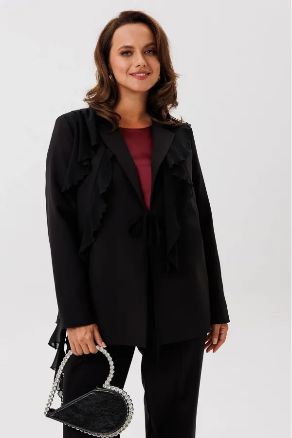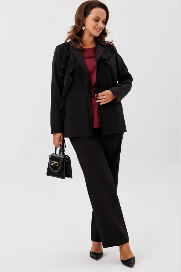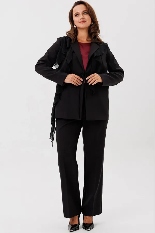Костюм женский трехпредметный, состоящий из жакета, блузки и брюк. Жакет полуприлегающего силуэта, скомбинированный из двух видов ткани с центральной бортовой застежкой встык на завязки с фигурным подрезом из горловины и до бокового шва. Жакет с ассиметричными вставками из шифона в виде воланов. По правой части переда шифон с 3 складками вставлен по плечевому шву, частично по горловине и ниспадает из пройм. Второй волан вставлен в рельефный подрез, имеет разную ширину и не доходя до бокового шва ниспадает сходя на нет шлейфом. По левой части переда шифоновый волан фигурной формы вставлен в плечевой шов, горловину, и ниспадает на нет. Спинка со средним швом. Рукав втачной длинный двухшовный. Брюки классического кроя, прямые, с заутюженными кантами, с притачным поясом сзади на резинке и боковыми карманами с отрезным бочком. Застежка на тесьму-молнию в средних срезах передних половинок брюк.