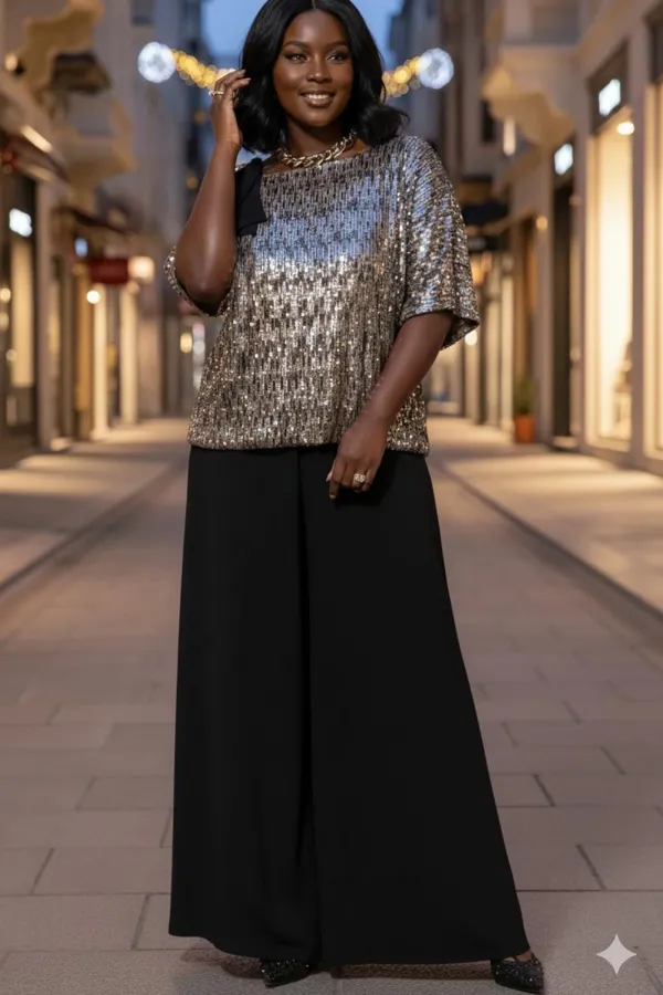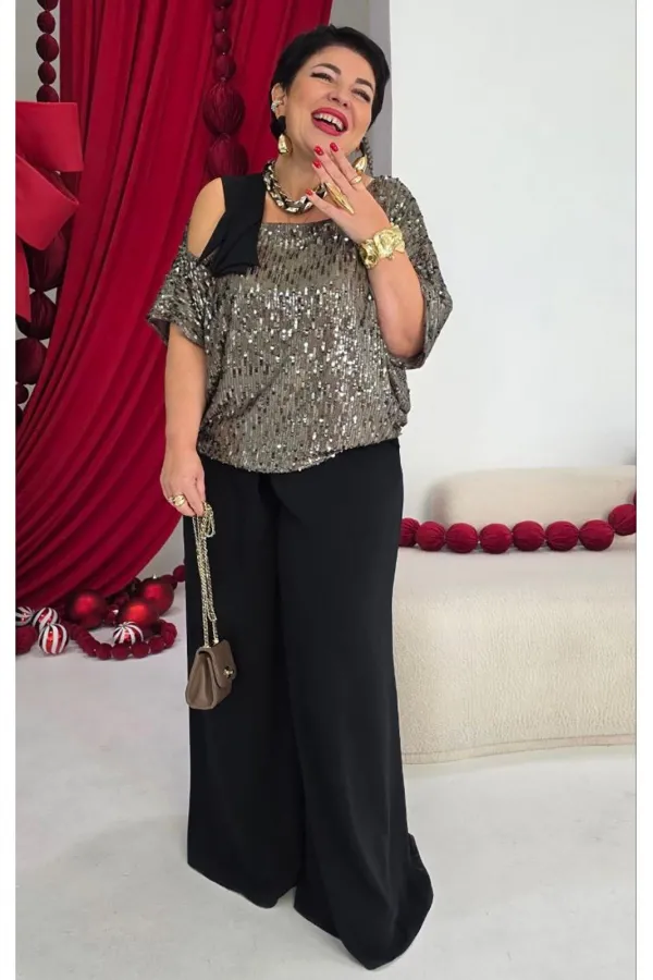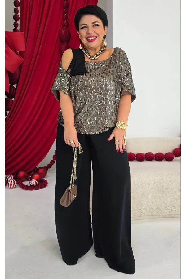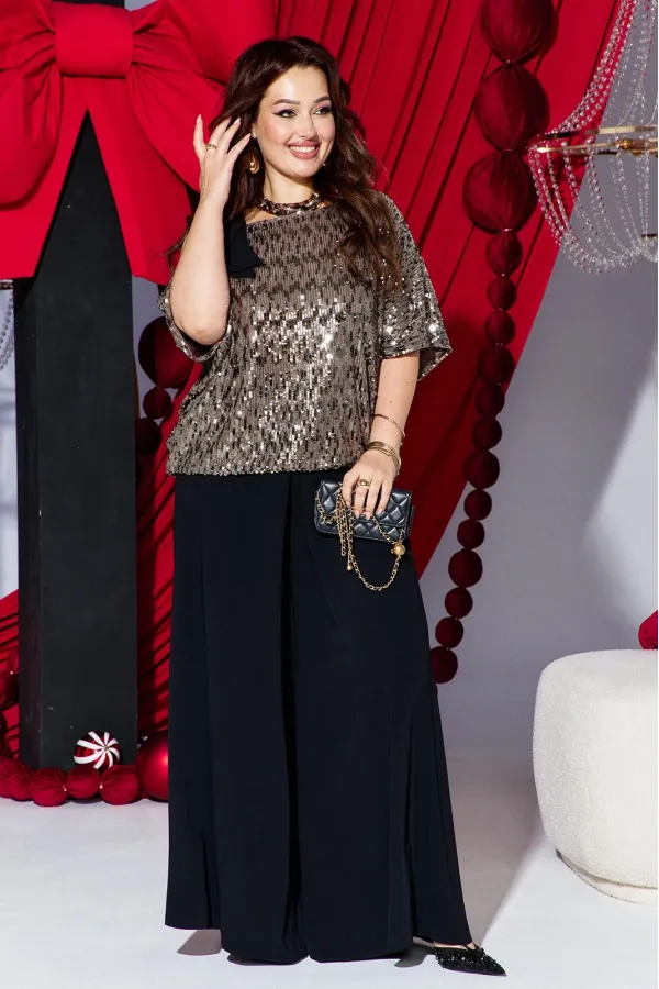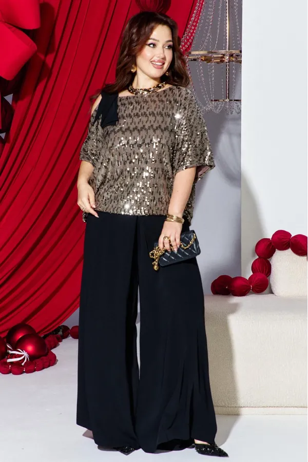 Это стильный и современный ансамбль, который состоит из блузы и брюк. Изысканный женский комплект идеален для торжественных мероприятий, он станет жемчужиной вашего гардероба. Брючный комплект можно дополнить минималистичными украшениями, которые подчеркнут утончённость, завершая этот элегантный, но уверенный образ. Сочетание классического чёрного цвета со сверкающими пайетками в одном образе превратит обыденное событие в настоящий феерический праздник! Блуза (состав: 100% полиэстер) выполнена из мерцающих пайеток богатого кофейного оттенка создаёт невероятно праздничный образ. Блуза свободного силуэта с асимметричной формой горловины: одно плечо открыто, расположен декоративный элемент чёрного цвета из отделочной ткани. Рукав цельнокроеный. Спинка без особенностей. Блуза на подкладке. Брюки (состав: 100% полиэстер) свободного кроя выполнены из плотной, матовой ткани чёрного цвета. Их широкий фасон и высокая посадка на талии создают элегантный и удлинённый силуэт, а также контрастируют с лёгким и воздушным верхом. Пояс в брюках притачной со вставкой эластичной тесьмы-резинки в бочках. По переду брюк от пояса застрачивается складка. В среднем шве брюк застёжка на потайную тесьму молнию и пуговицу в поясе. Длина блузы 56,5 см (р 52-56), 57,5 см (р 58-62), длина рукава 36,5 см (р 52-56), 37,5 см (р 58-62). Длина брюк 108 см.